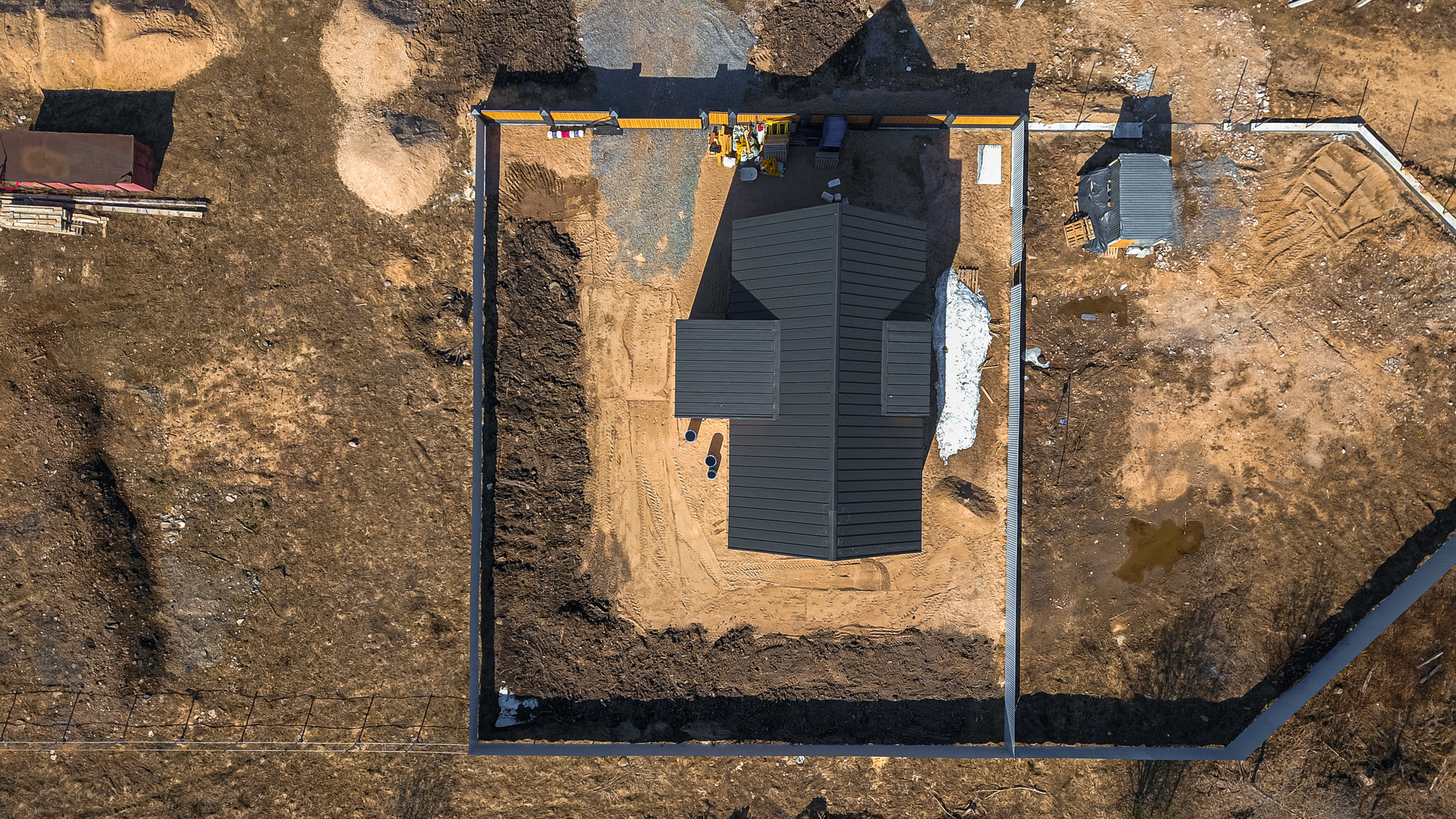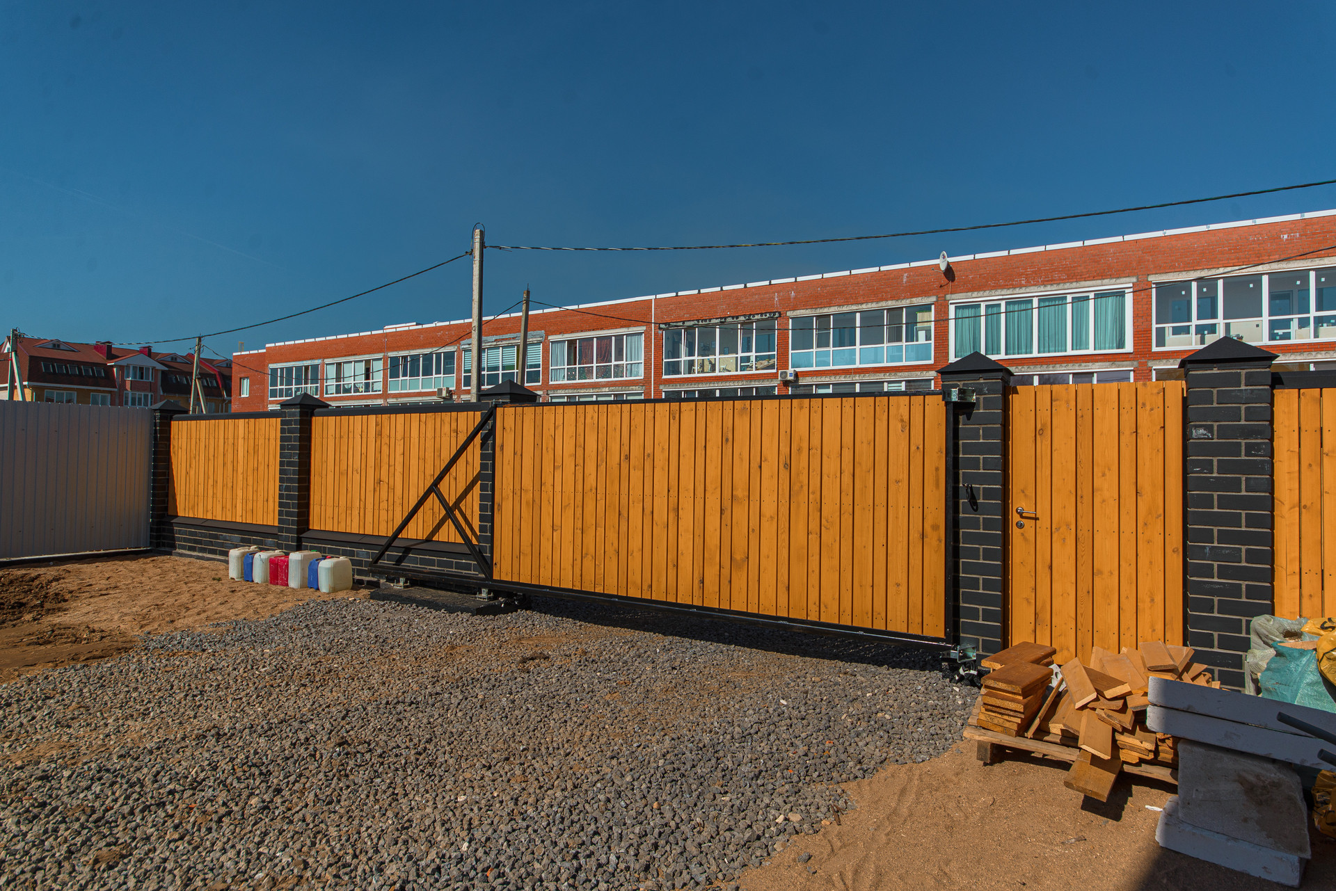 Забор - профнастил по периметру участка, с центральной стороны на ленточном фундаменте, сдвижные автоматические ворота и итальянским двигателем.