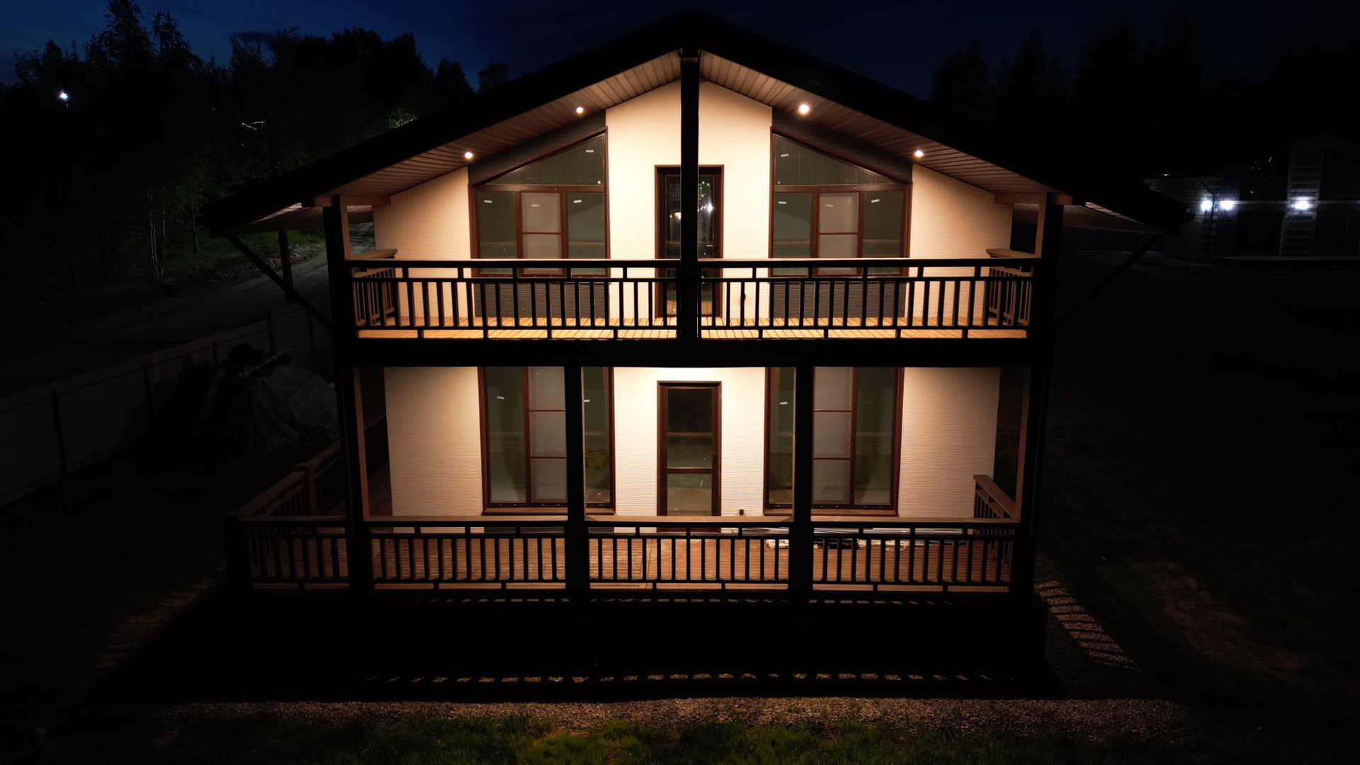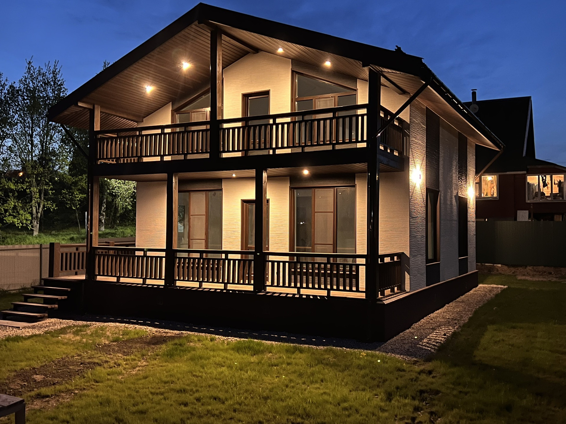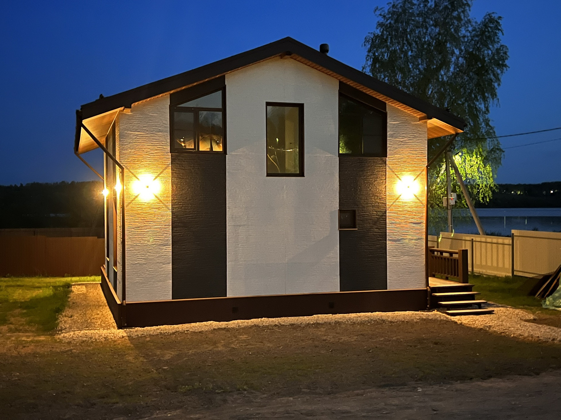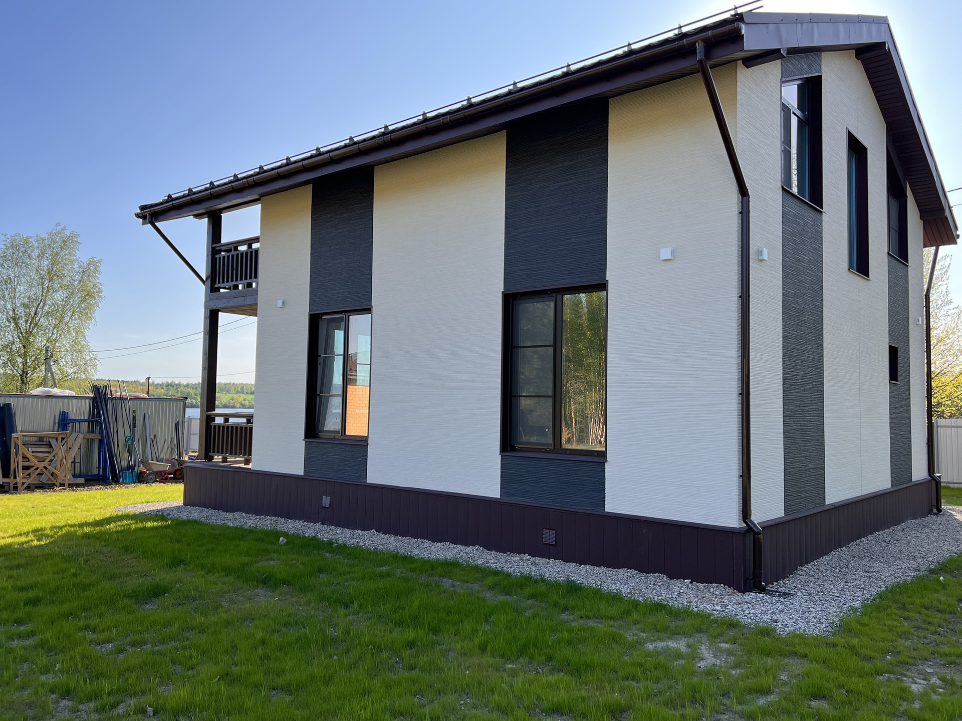 Фундамент монолитная плита 300 мм, материал внешних стен каркас, внешняя отделка фиброцементный сайдинг, внутренняя отделка влагостойкий гипсокартон.