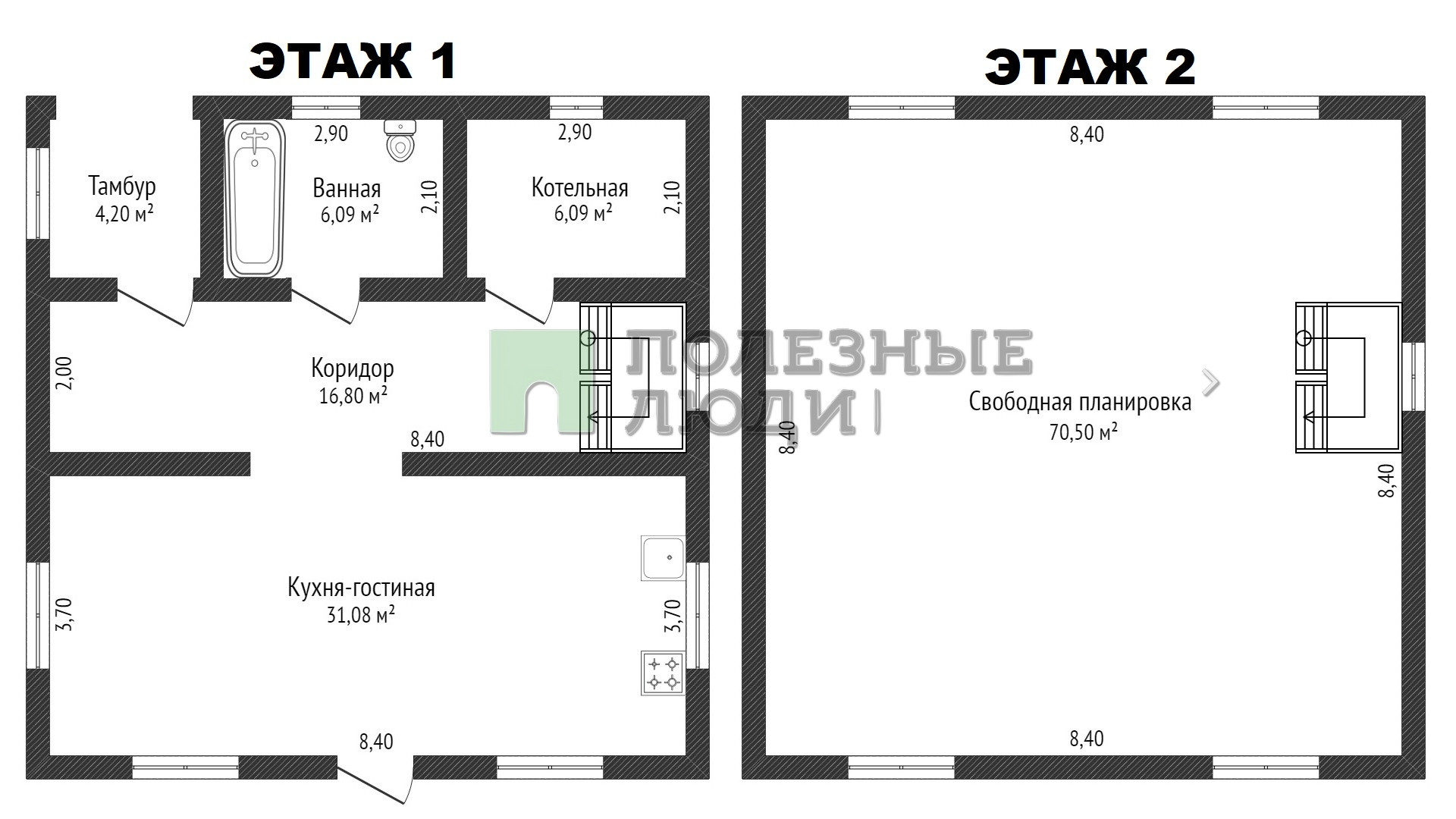 ► Дом в два этажа, ориентировочная площадь 140м2, материал стен - газобетон, фундамент - монолитная плита 350мм