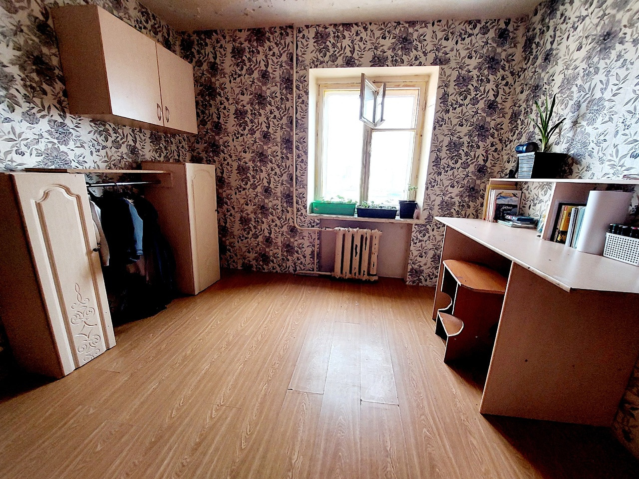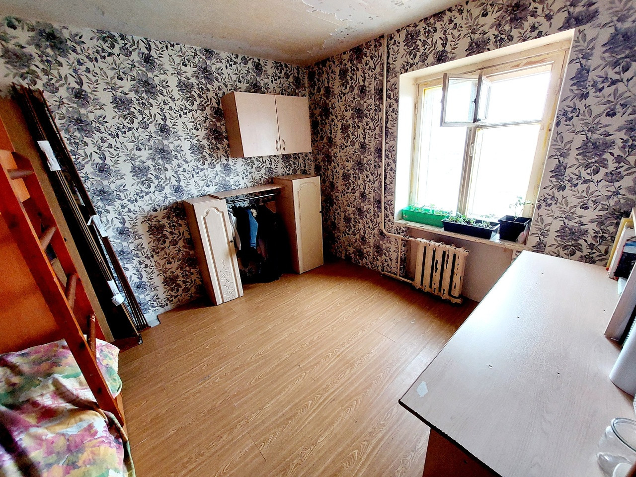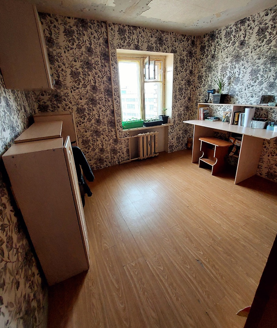 Комната в жилом состоянии. Окно остеклено пластиковыми стеклопакетами, на полу настелен ламинат, стены оклеены обоями, установлен натяжной потолок.
