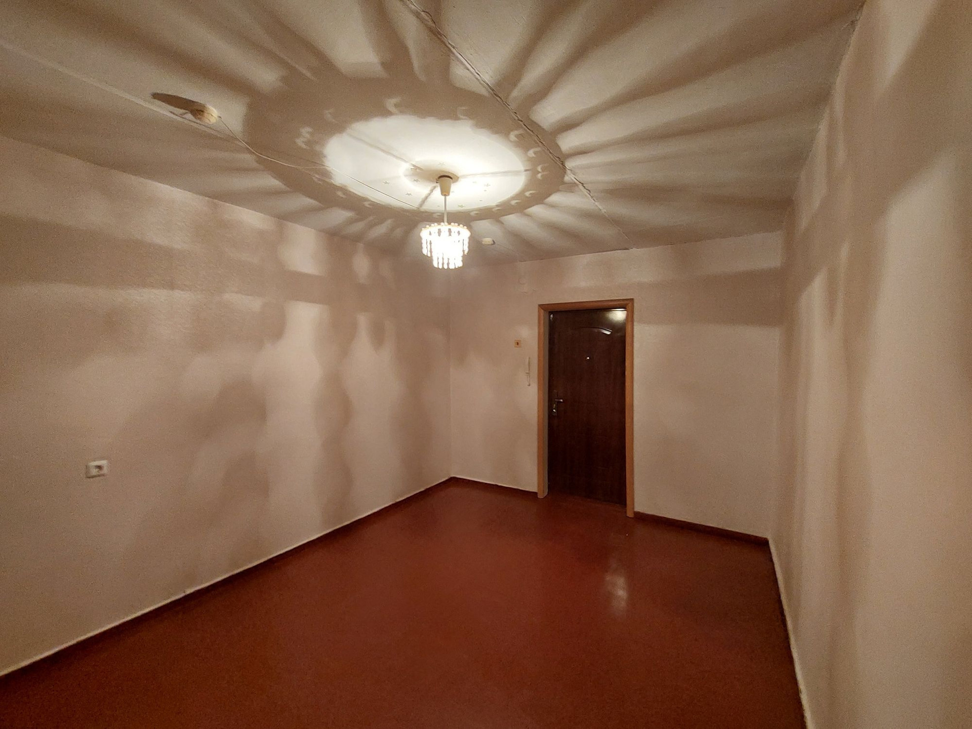 Комната в жилом состоянии, стены оклеены обоями,  на полу крашеная двп, батарея чугунная, окно остеклено деревянными рамами, металлическая входная дверь.
