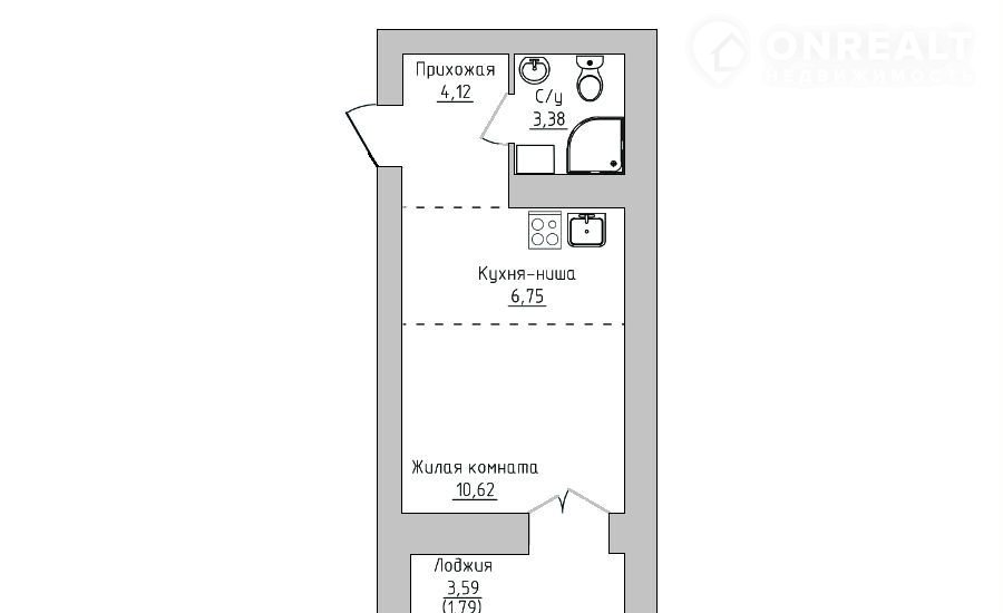 Kуxня - ниша 6,75/ кoмнaта 10,62/ сaнузeл 3,38/ пpихожaя 4,12/ лоджия 3,59