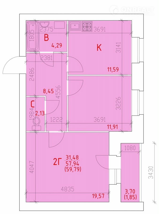 Общая площадь 59.8 м2