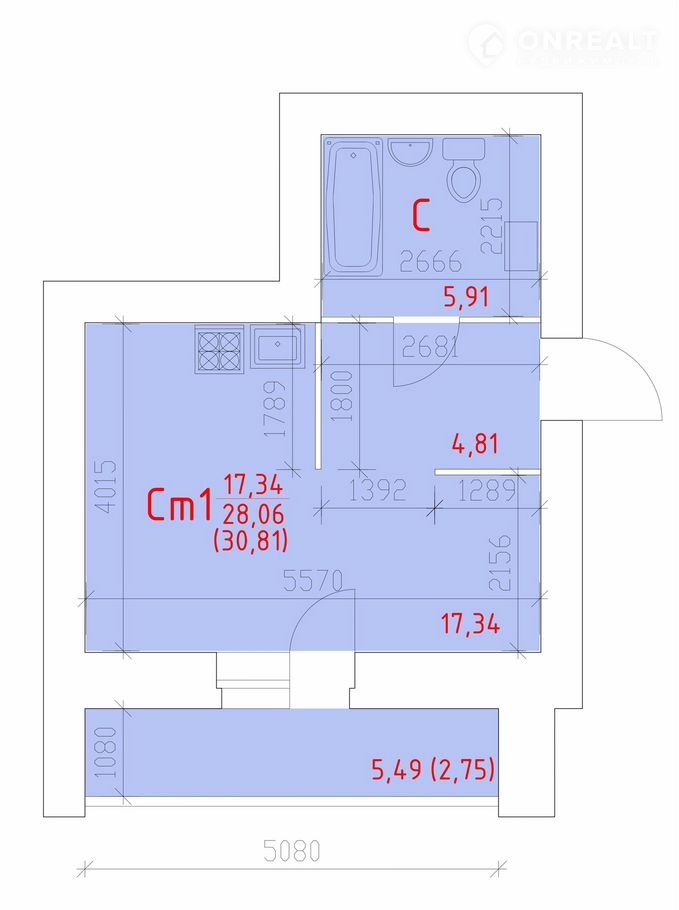 Общая площадь 30.8 м2