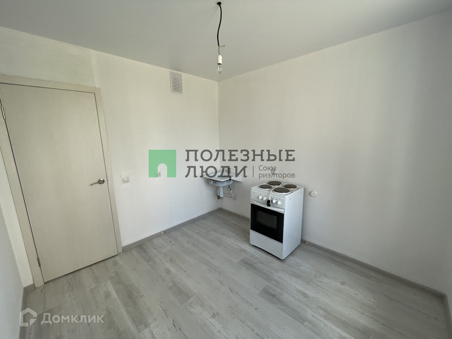 На стенах светлые обои, на полу светлый ламинат, белый натяжной потолок.