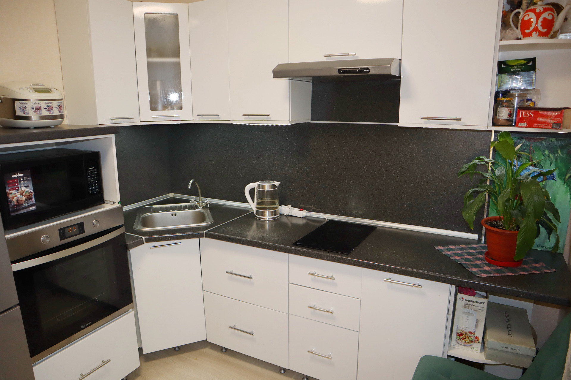 - Кухонный гарнитур с варочной панелью, вытяжкой и духовым шкафом, при желании есть место для посудомоечной машины.