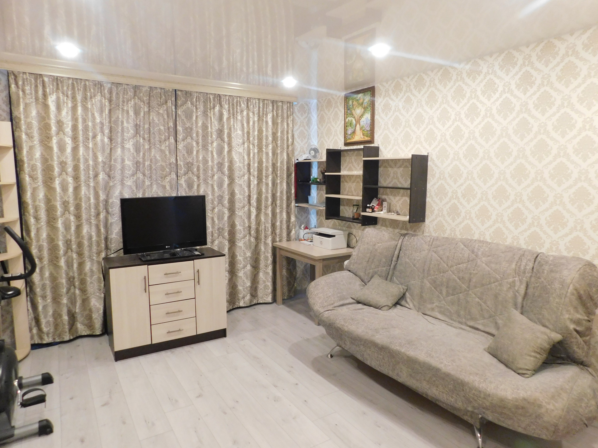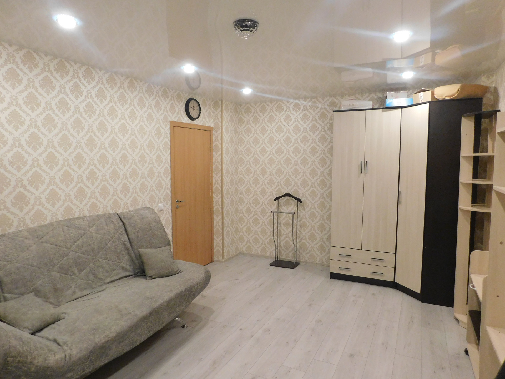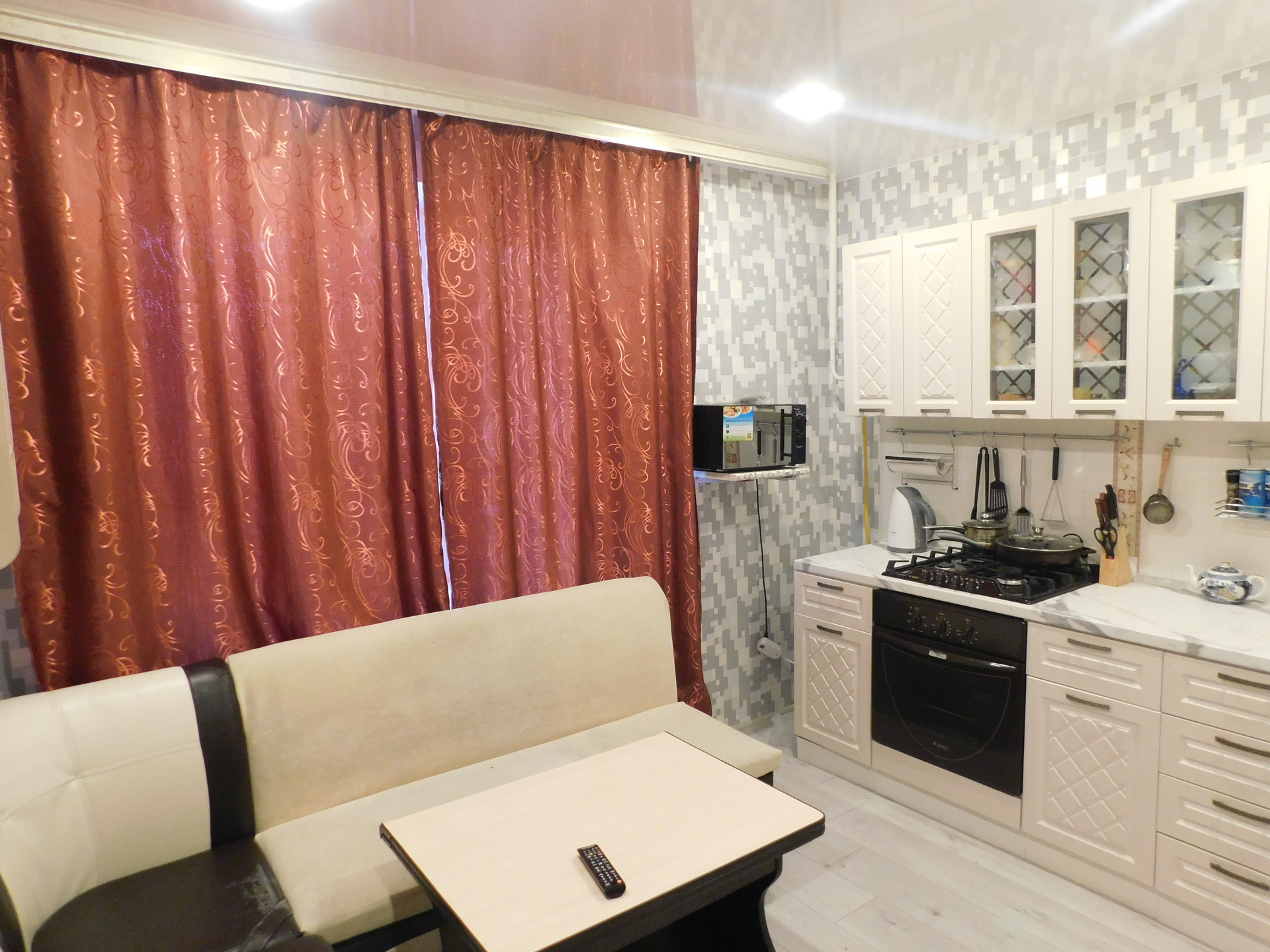 При продаже остается кухонный гарнитур, варочная панель, духовой шкаф, диван и шкаф в комнате.