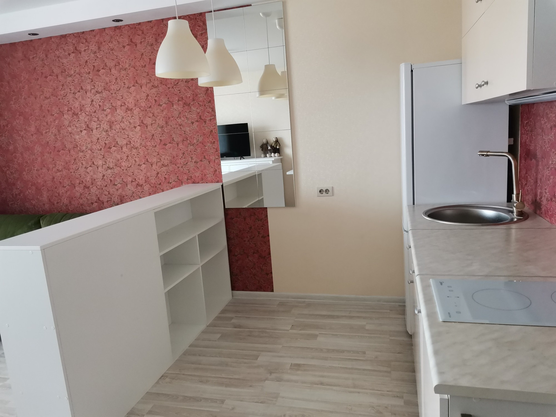 В квартире остается: кухонный гарнитур, шкаф-купе, этажерка-разделитель, зеркало, люстры.