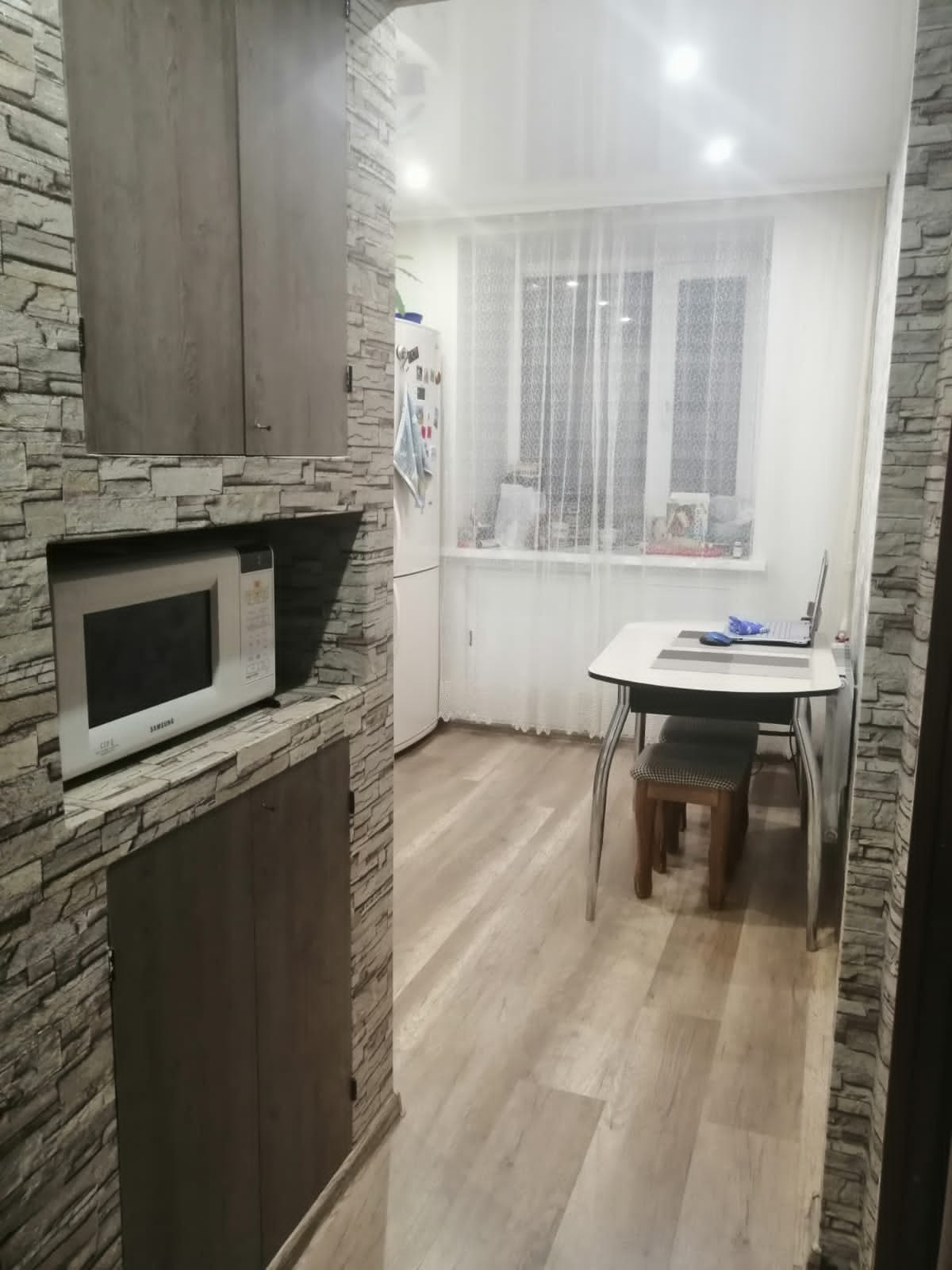 Квартира в идеальном состоянии: двойные прочные входные двери, пол ламинат/линолеум, стильный кафель в с\у и ванной комнате, натяжные потолки, выровнены стены, обои. Новая проводка, радиаторы отопления, установлены счетчики. Квартира меблирована полностью, по желанию можно купить с мебелью ( останется все за 200 000 рублей). В прихожей вместительный шкаф-купе и качественная мебель под заказ. Встроенный кухонный гарнитур с эл.плитой и вытяжкой. Широкий подоконник с нишей для хранения заготовок «зимний холодильник». Окна выходят на запад и север, установлены стеклопакеты. Комнаты 15.2 кв.м. и 12 кв.м. с выходом на лоджию 6м (остеклена).