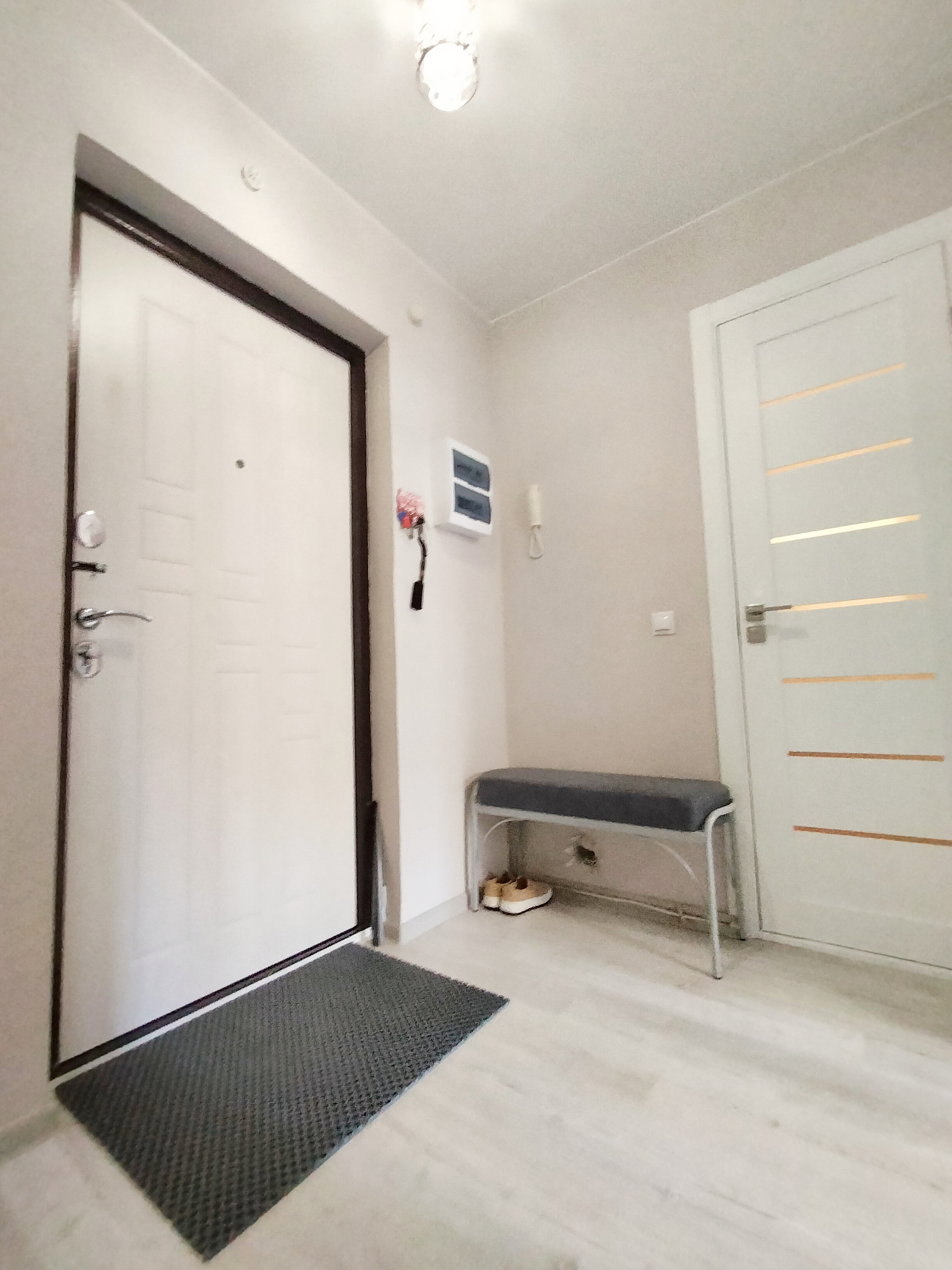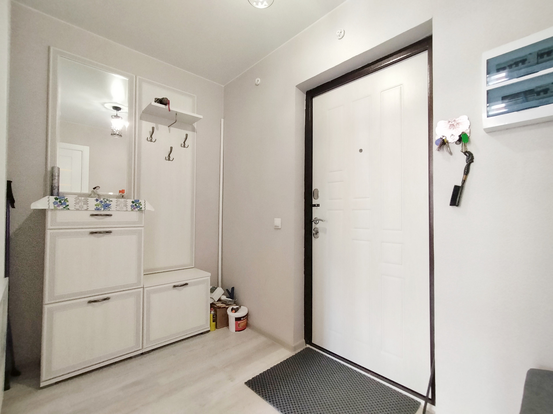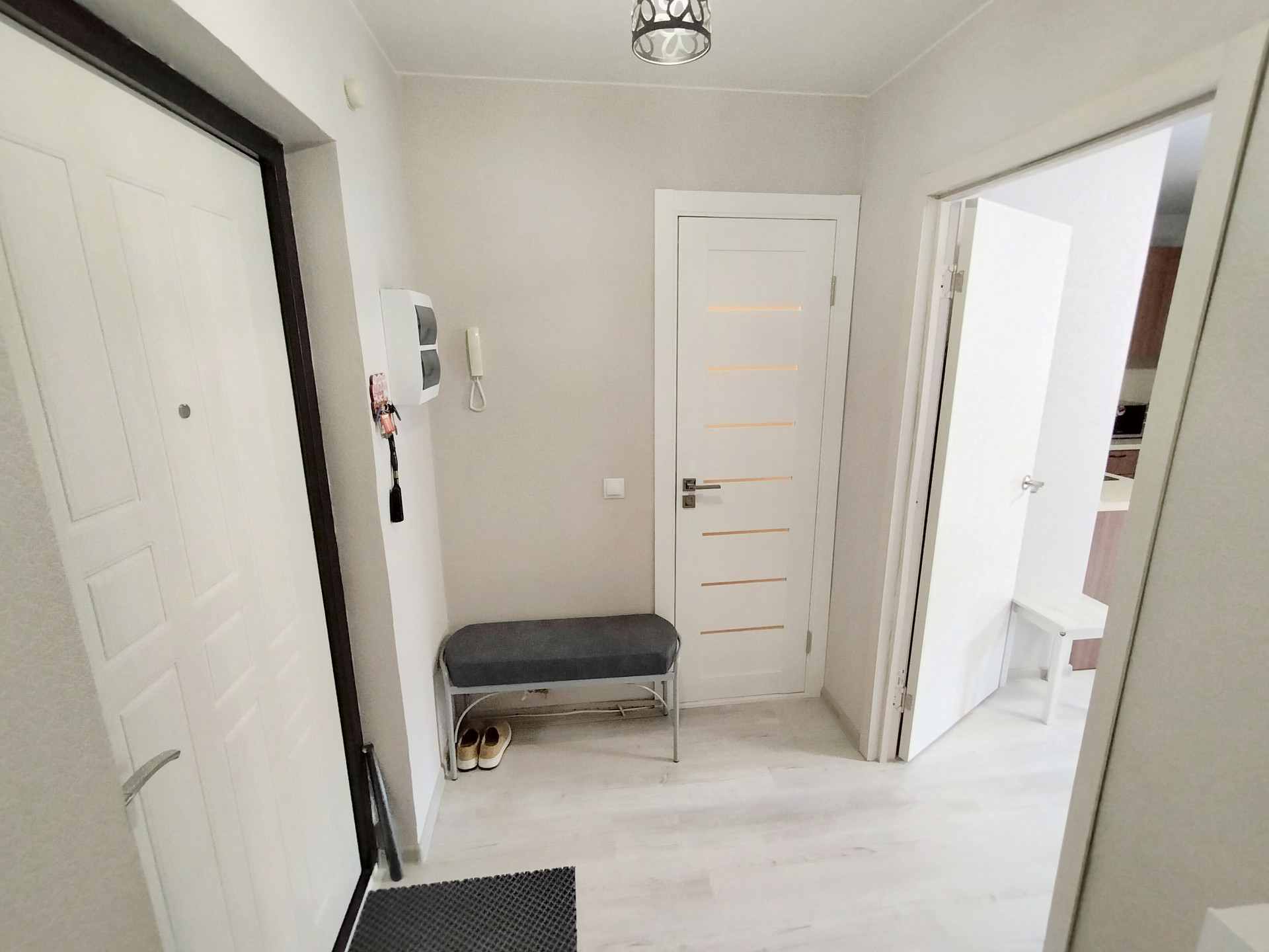• В квартире сделан ремонт “под ключ”: поклеены обои под покраску нейтрального цвета, на полу постелен износостойкий ламинат, натяжные потолки, установлены качественные межкомнатные двери.