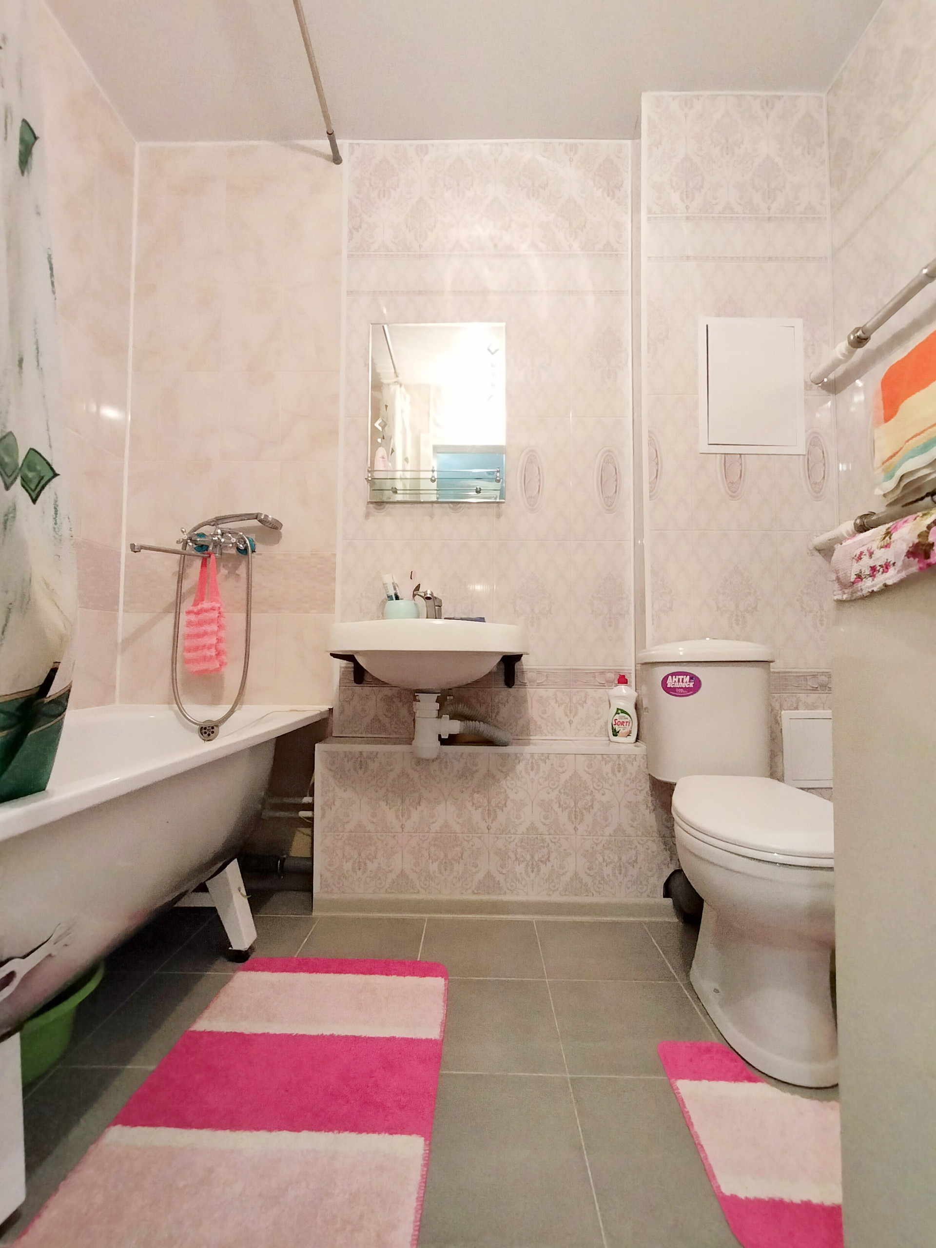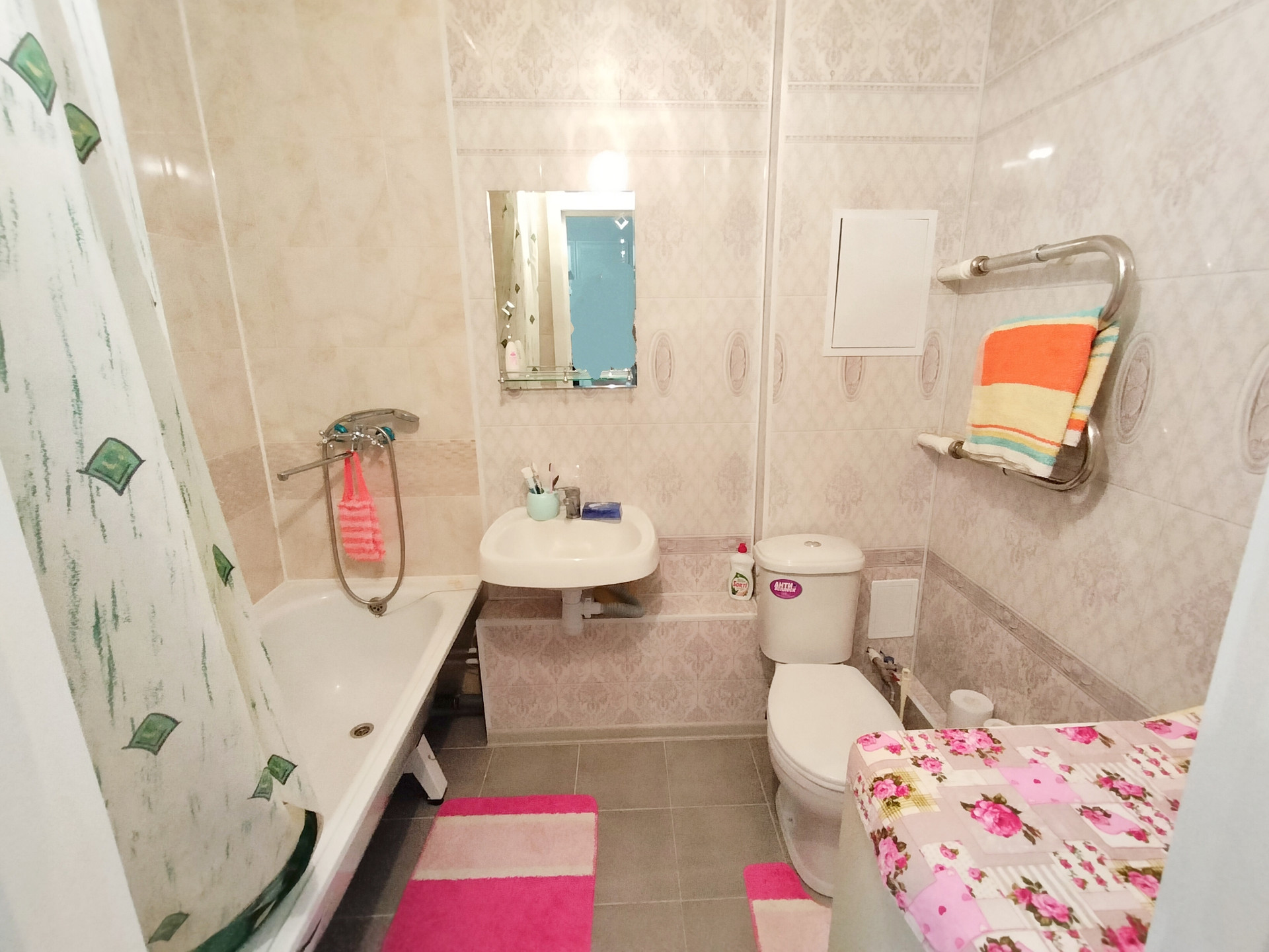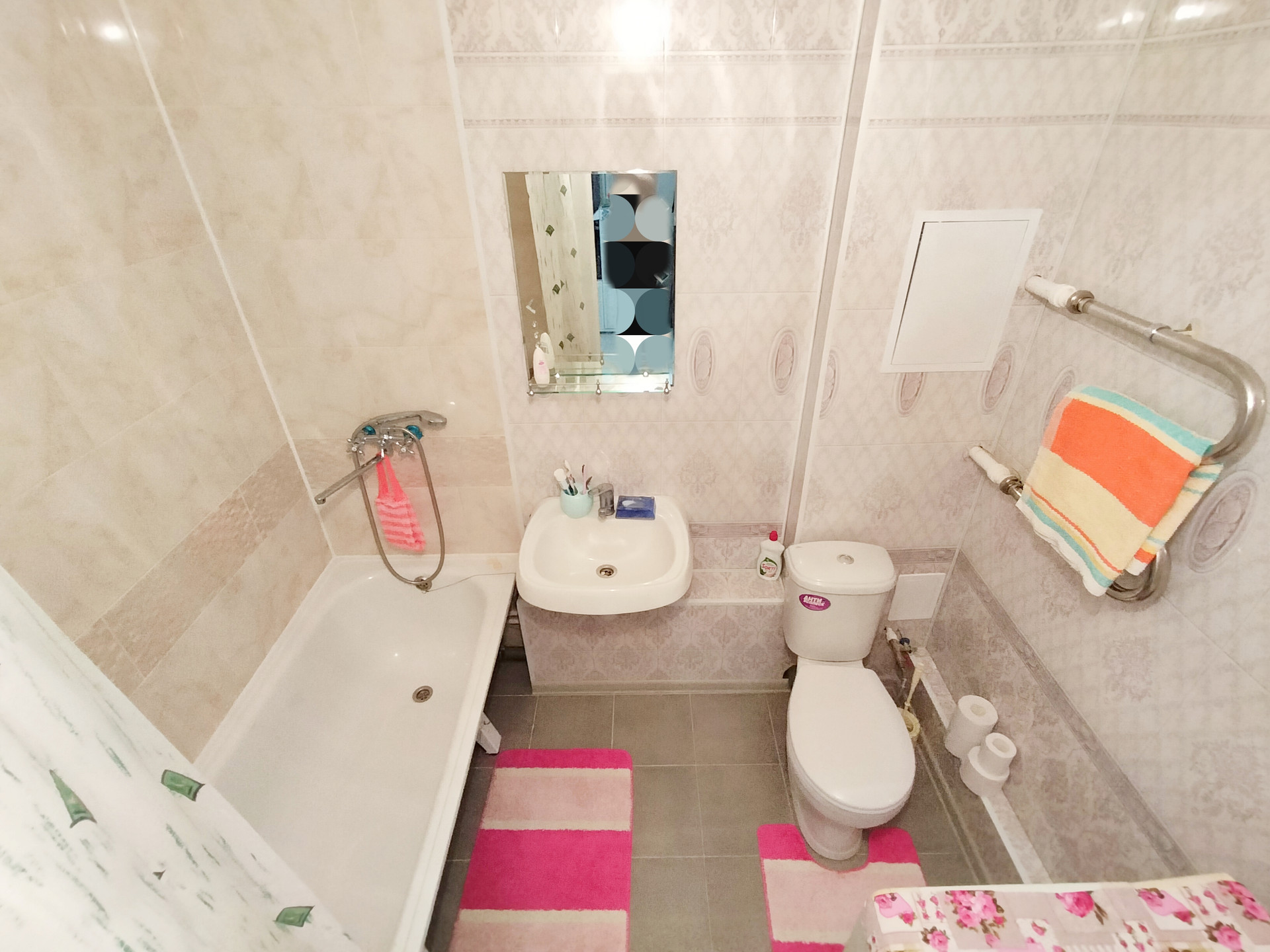 • Комфортный совмещенный санузел оснащен современной сантехникой. Установлен полотенцесушитель. Сделан свежий ремонт. Стены и пол облицованы кафелем.