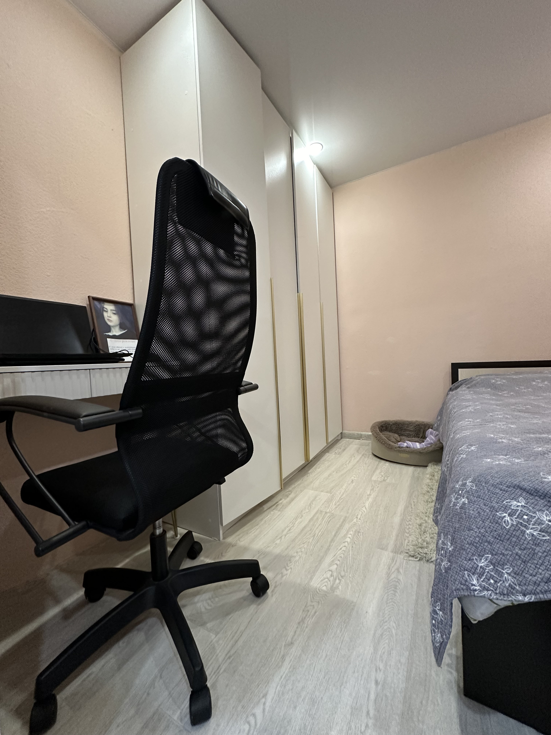 комната : кровать, кресло, встроенный шкаф выполнен за заказ с большой вместимостью,