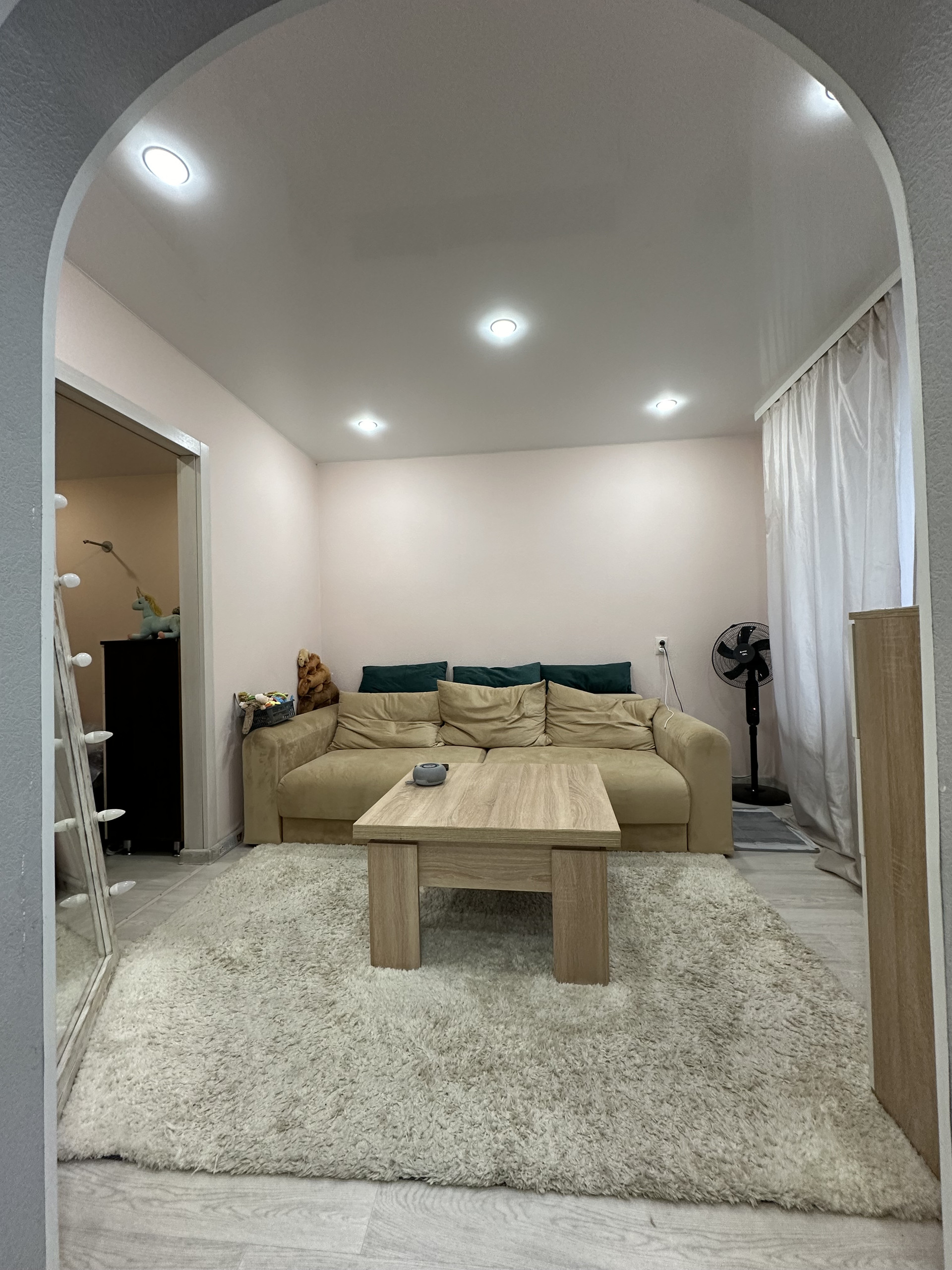 гостиная: камод, современный новый диван, зеркало с освещением, журнальный столик, в коридоре встроенный шкаф купе.