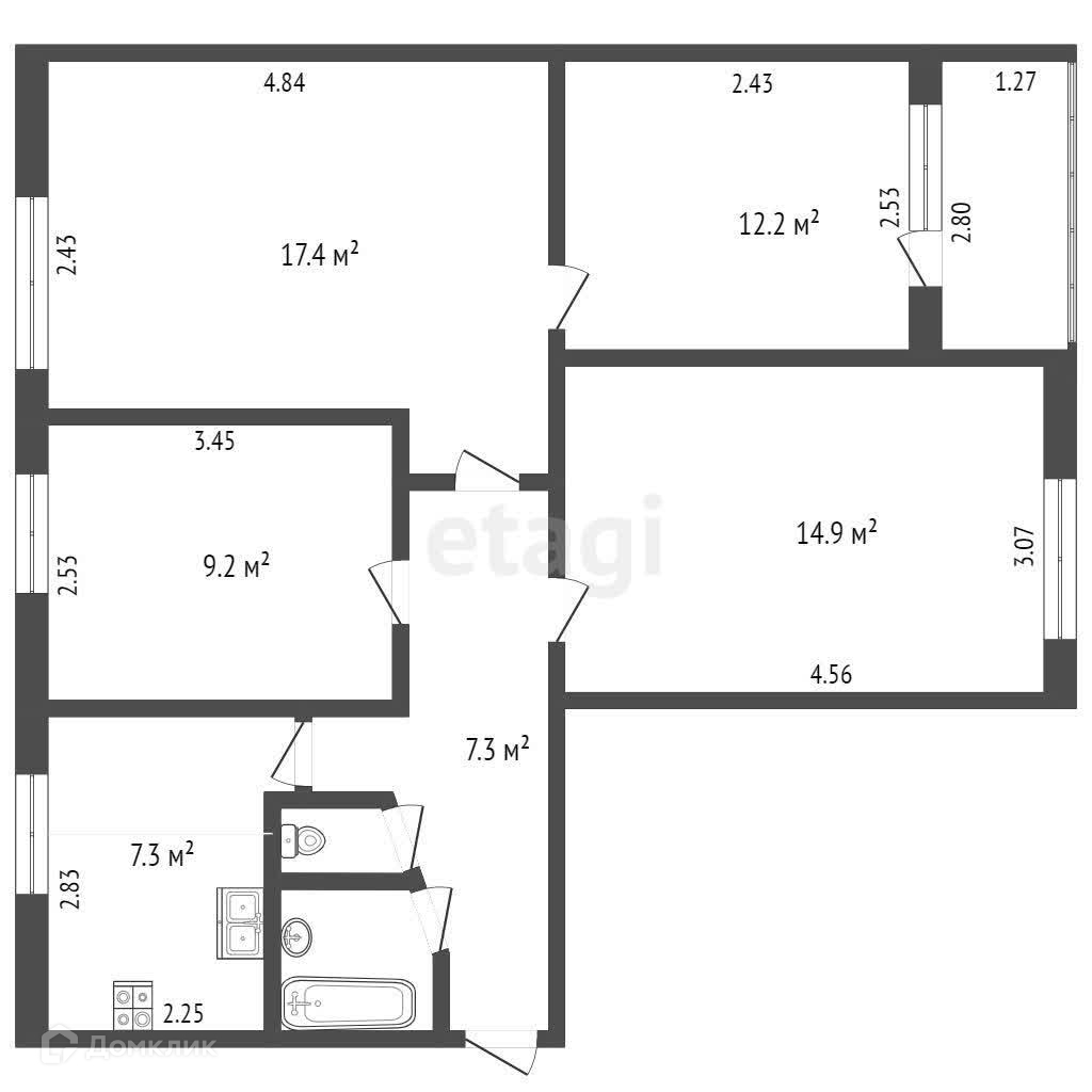 Квартира расположена на втором этаже девятиэтажного дома. Общая площадь составляет 69 квадратных метров, кухня составляет 7,3 кв. м. В квартире три спальни и одна гостиная комната. В гостиной есть небольшой бонус - действующий холодный шкаф в стене, который отлично функционирует в холодное время года.