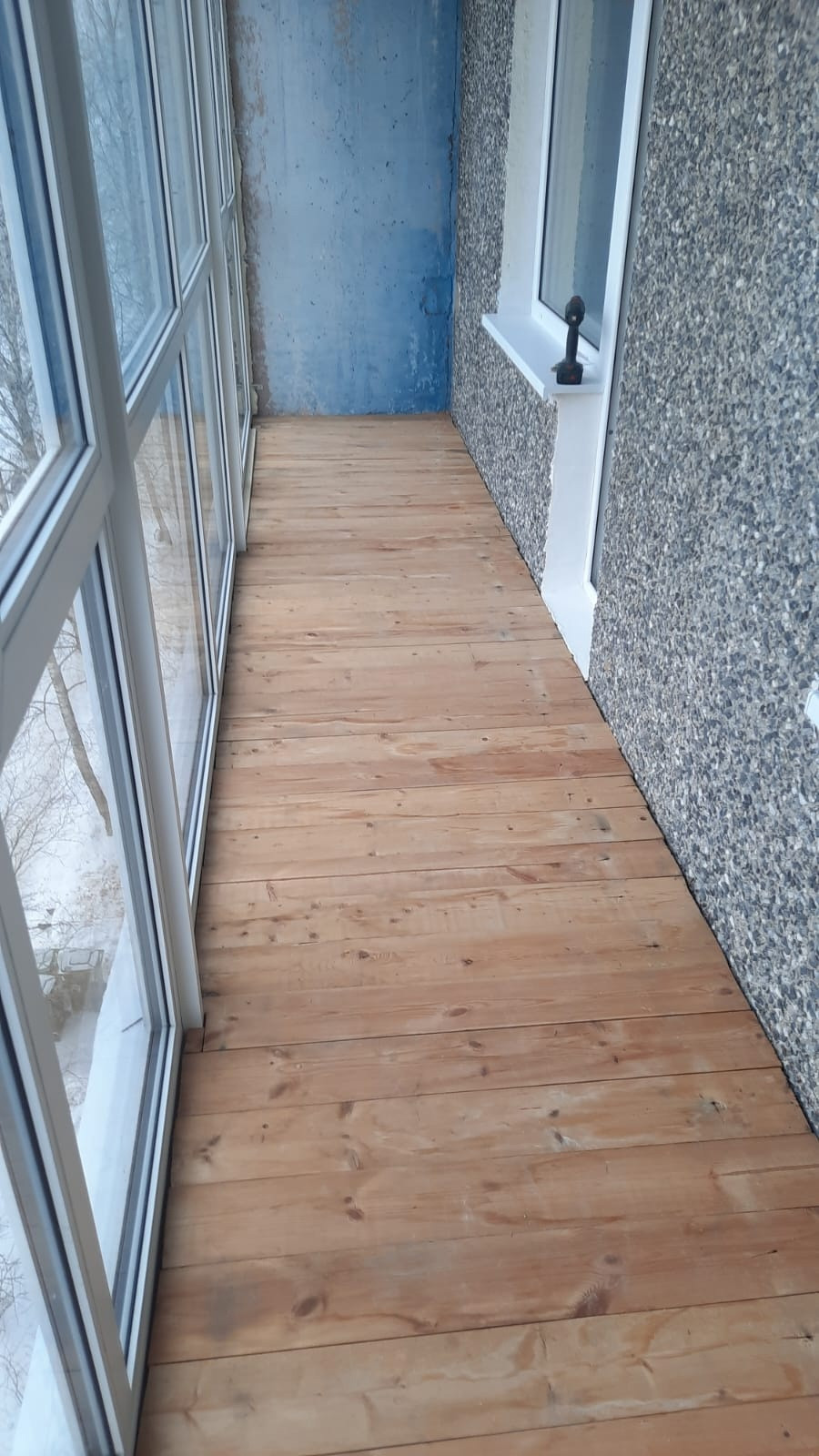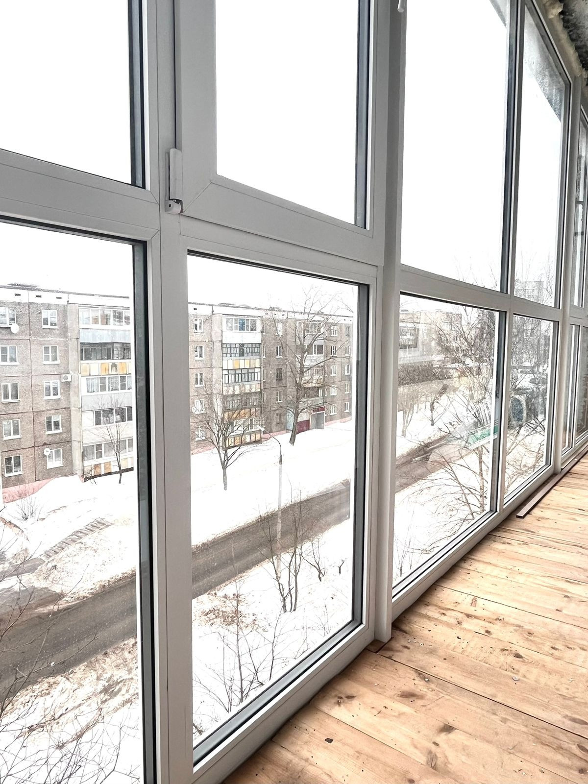 Лоджия 6,6 м, с красивым свежим панорамным остеклением с премиальный фурнитурой, пол деревянный (шпунтованная доска пола).