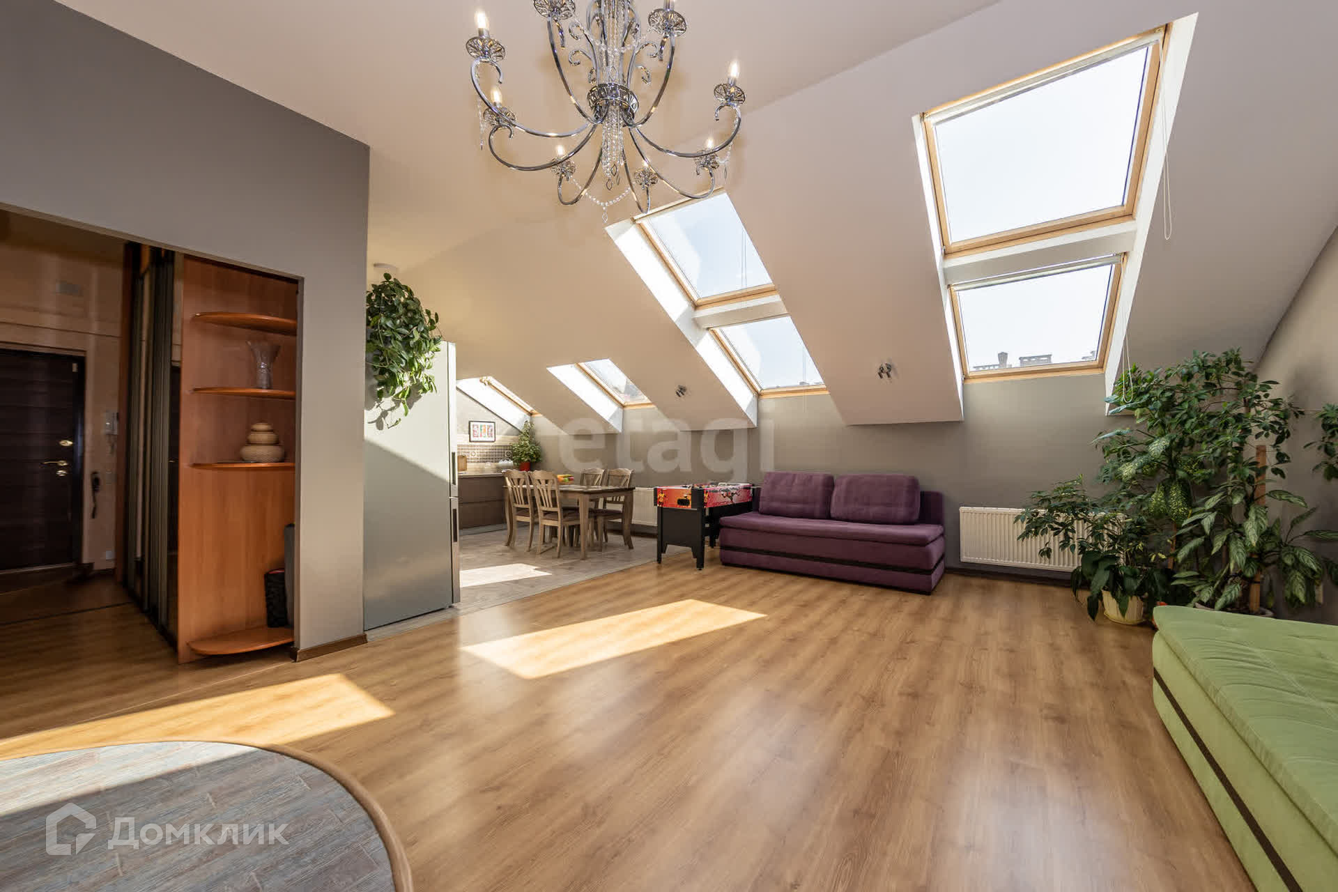 Обилие света и воздуха - одно из главных преимуществ этой квартиры. Благодаря большим окнам в крыше, вы сможете наслаждаться солнечными лучами, каплями дождя и звездами прямо из дома. К тому же, окна выполнены из деревянных стеклопакетов, что обеспечивает экологичность и практичность.