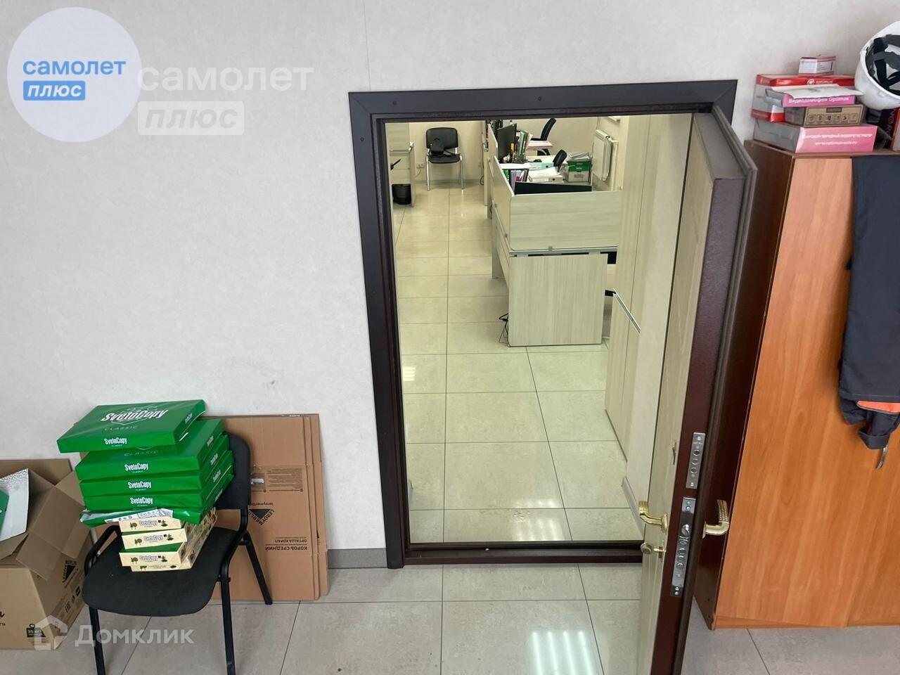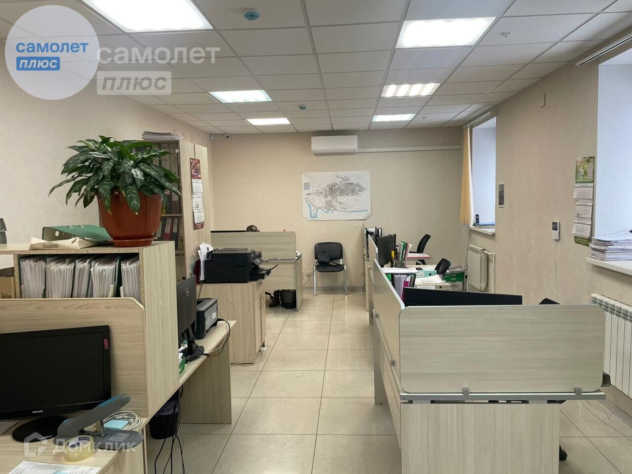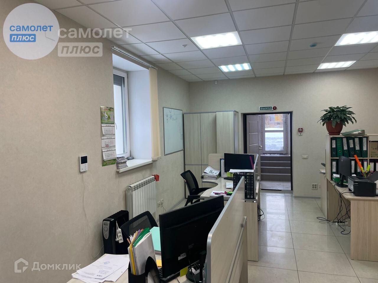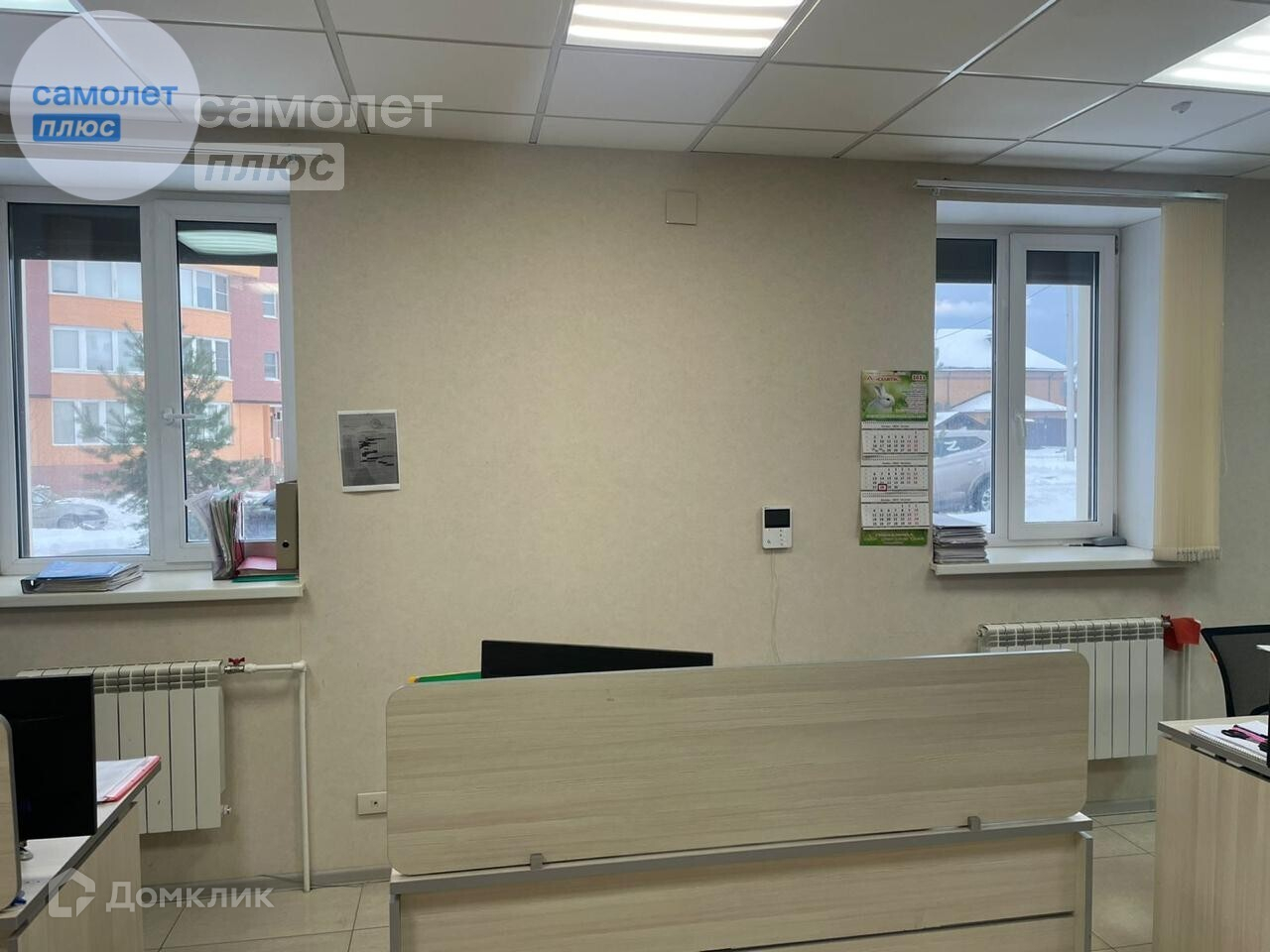 Потолок армстронг. Пол плитка. Дверь в офис 190/105см. Под каждым окном радиатор. Плюс радиатор в тамбуре.