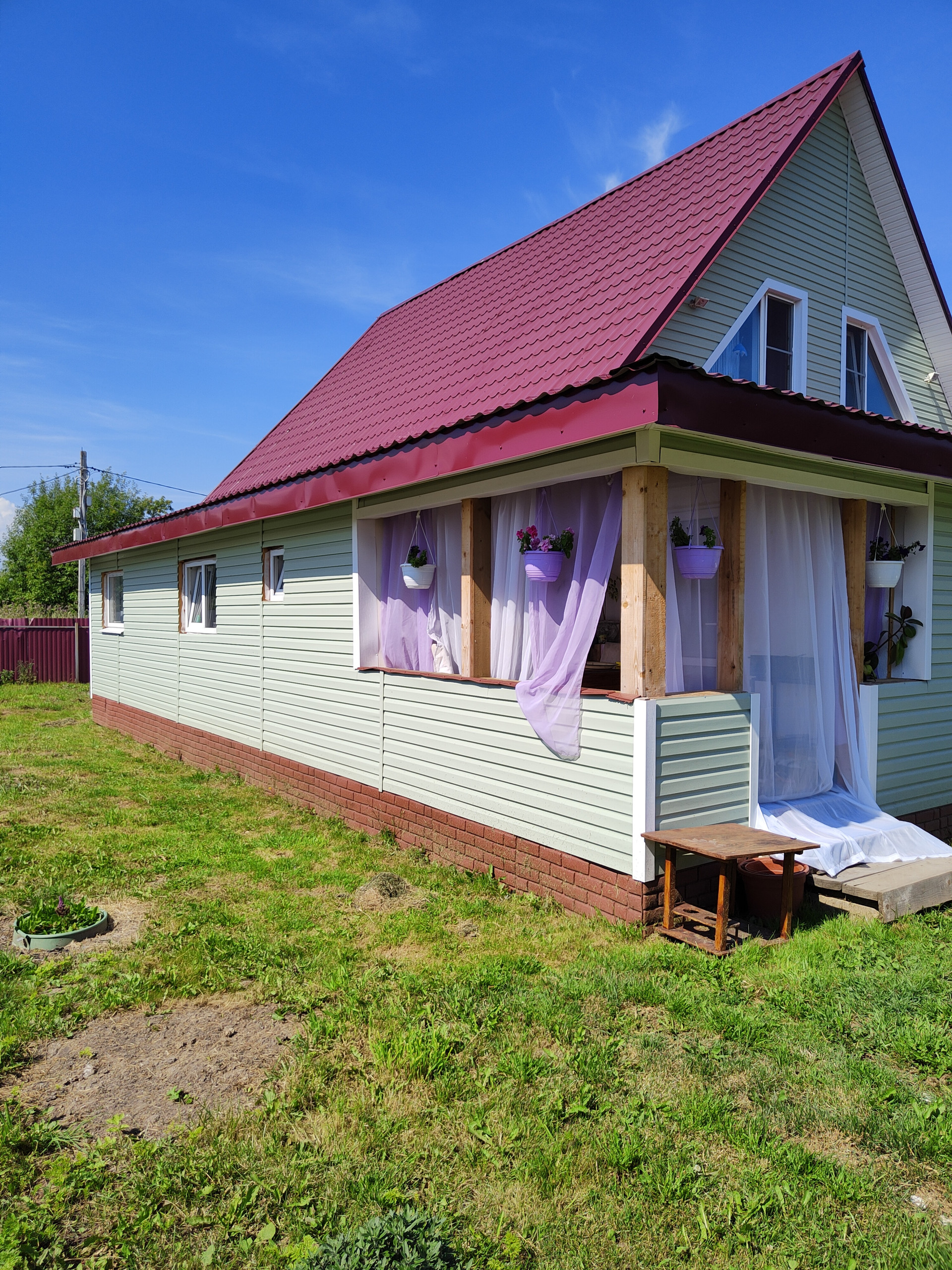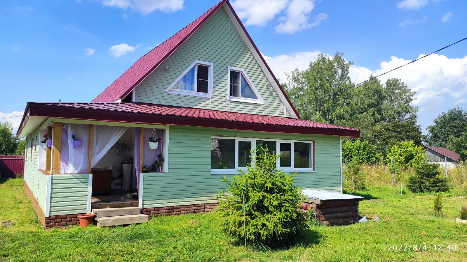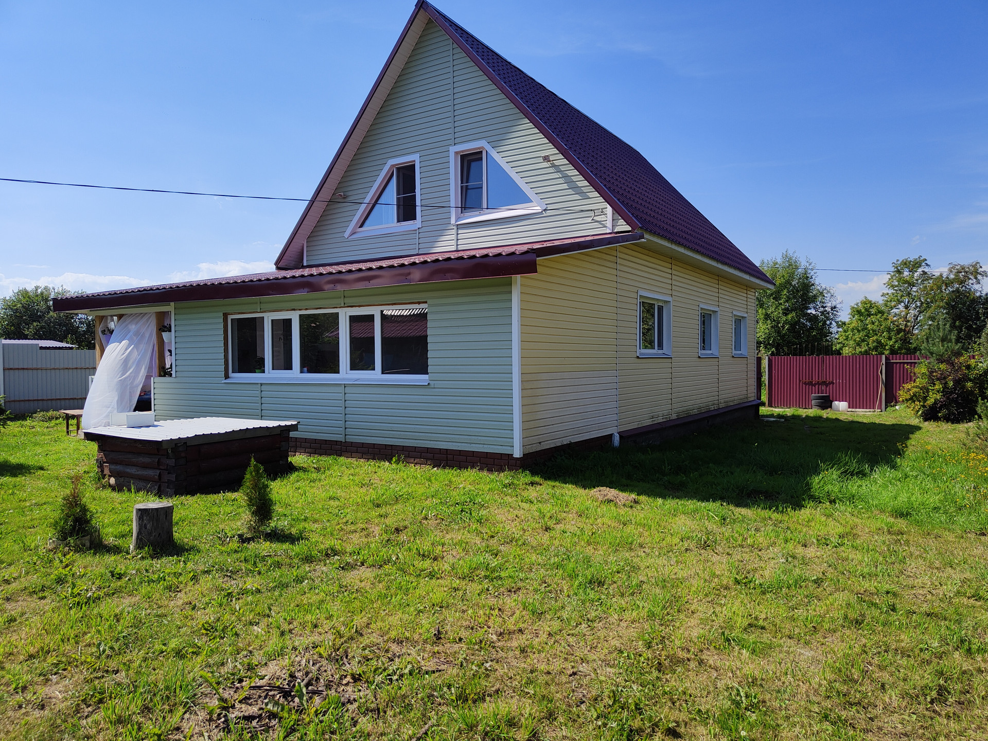 Двух этажный дом из брёвна, обшит сайдингом, 10,05 на 7,05 плюс новая пристройка каркасник с двух сторон, общей площадью 63м. Фундамент ленточный и свайный.