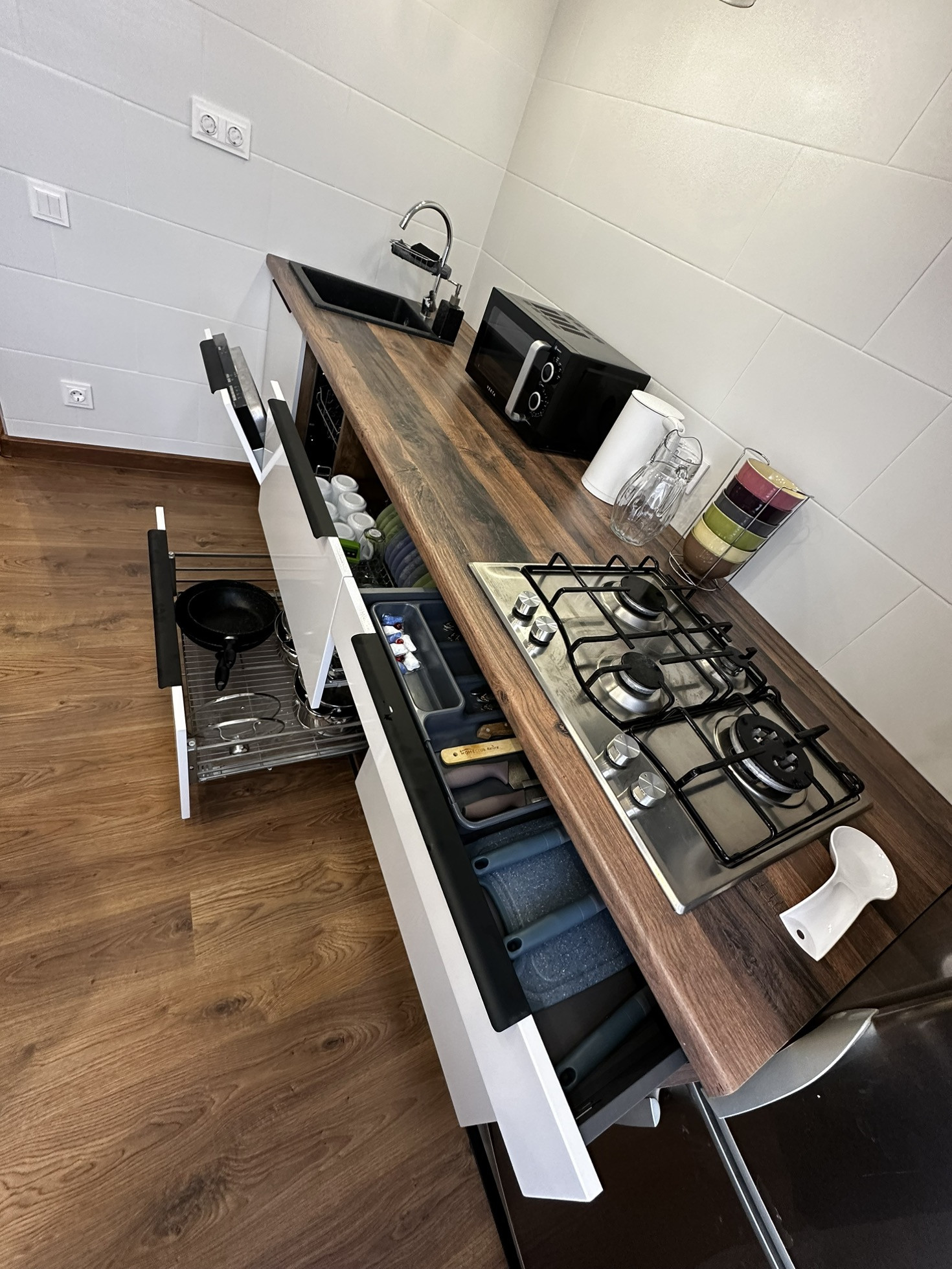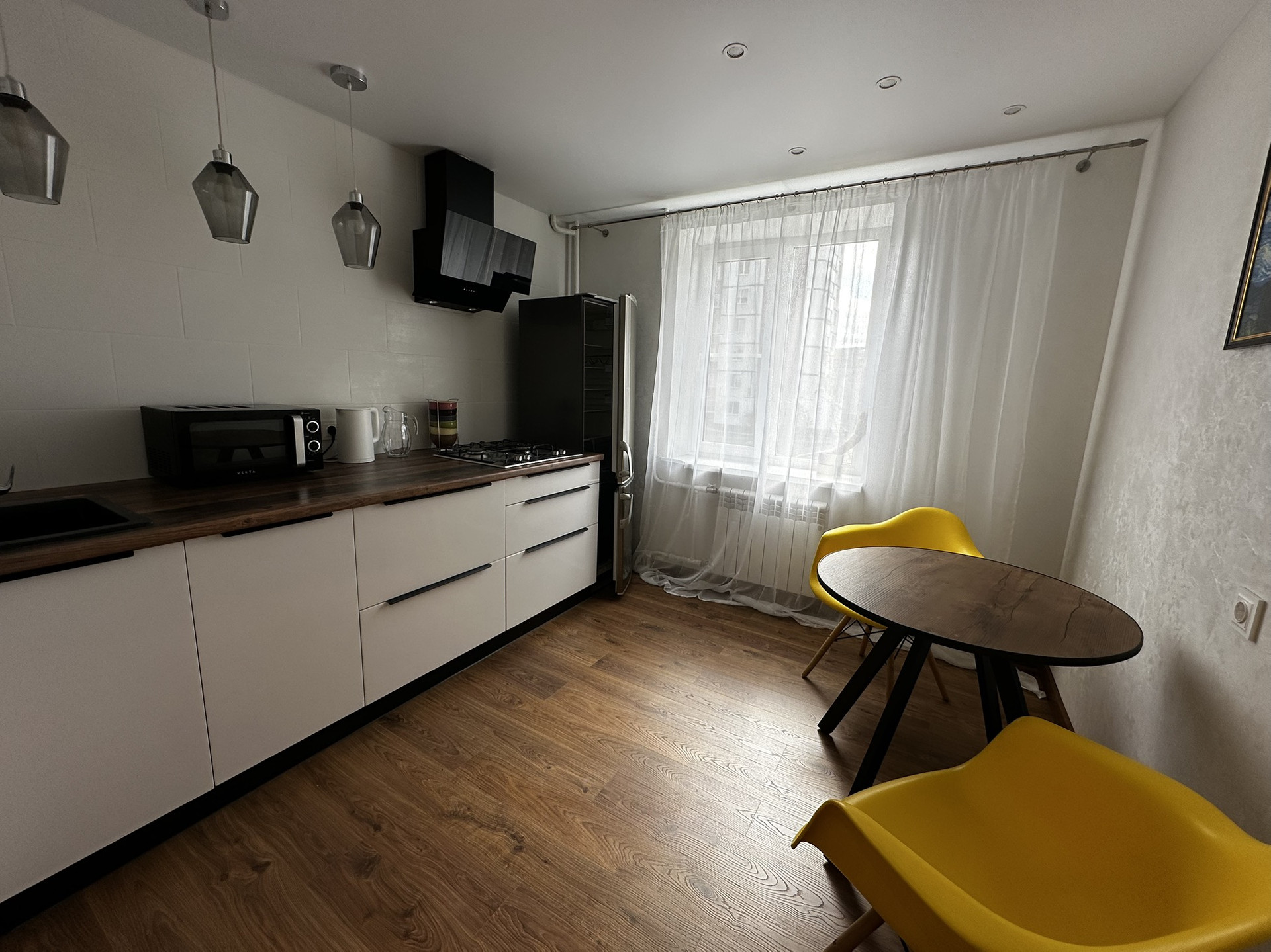 Техника: два телевизора - смарт тв, холодильник, микроволновая печь, стиральная и посудомоечная машины, водонагреватель на период отключения горячей воды, пылесос, утюг.