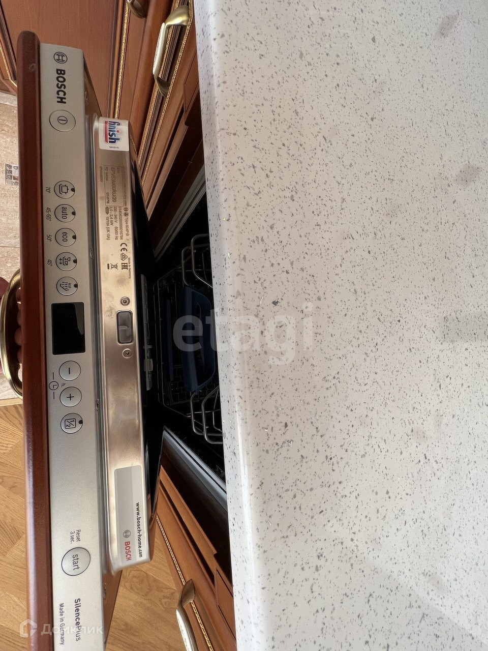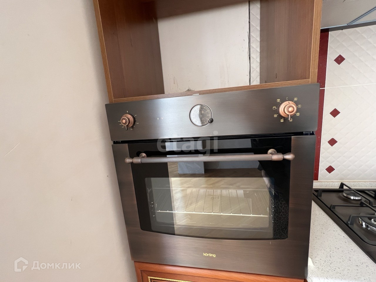 На кухне установлена мебель фирмы Мария и техника от немецкого бренда Korting, в столовой зоне имеется большое окно.