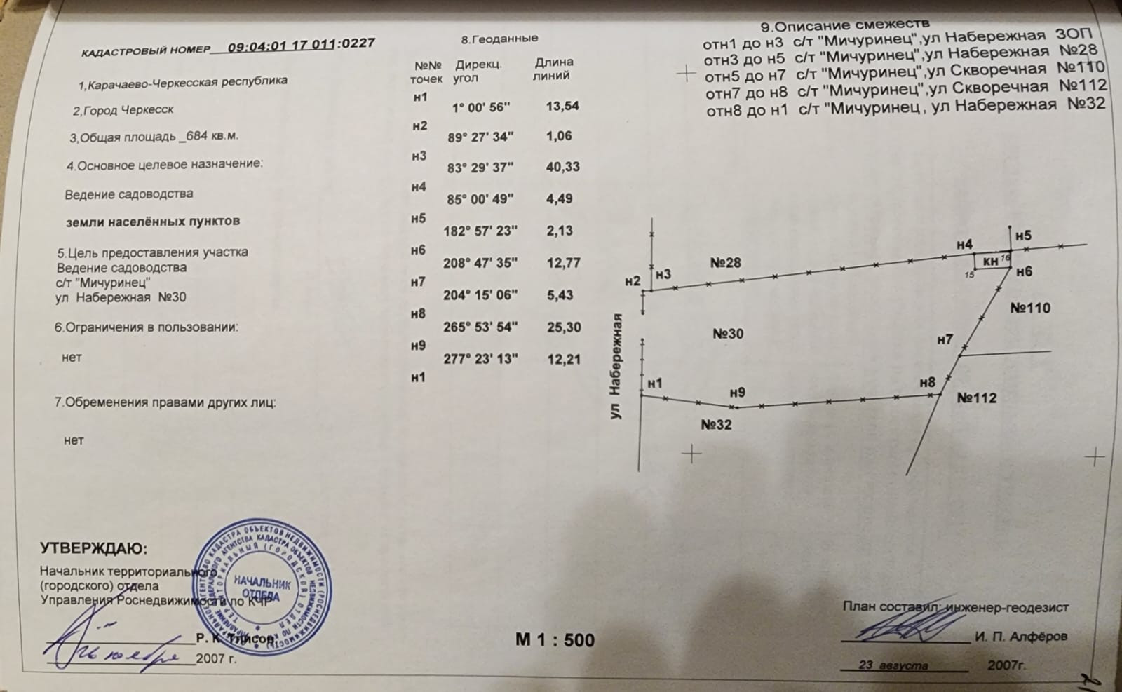 Продается ухоженный земельный участок (земли населенных пунктов) правильной формы (ровный) для строительства дачи или коттеджа (с возможностью регистрации) рядом с рекой Кубань, 6,84 соток, г. Черкесск, садоводческое товарищество «Мичуринец». Участок электрифицирован. Газ и вода подведены к границе участка. В собственности (один собственник – все документы в наличии), без обременений. Продает собственник – просьба агентов не беспокоить. Разумный торг уместен. Показ по предварительному согласованию.