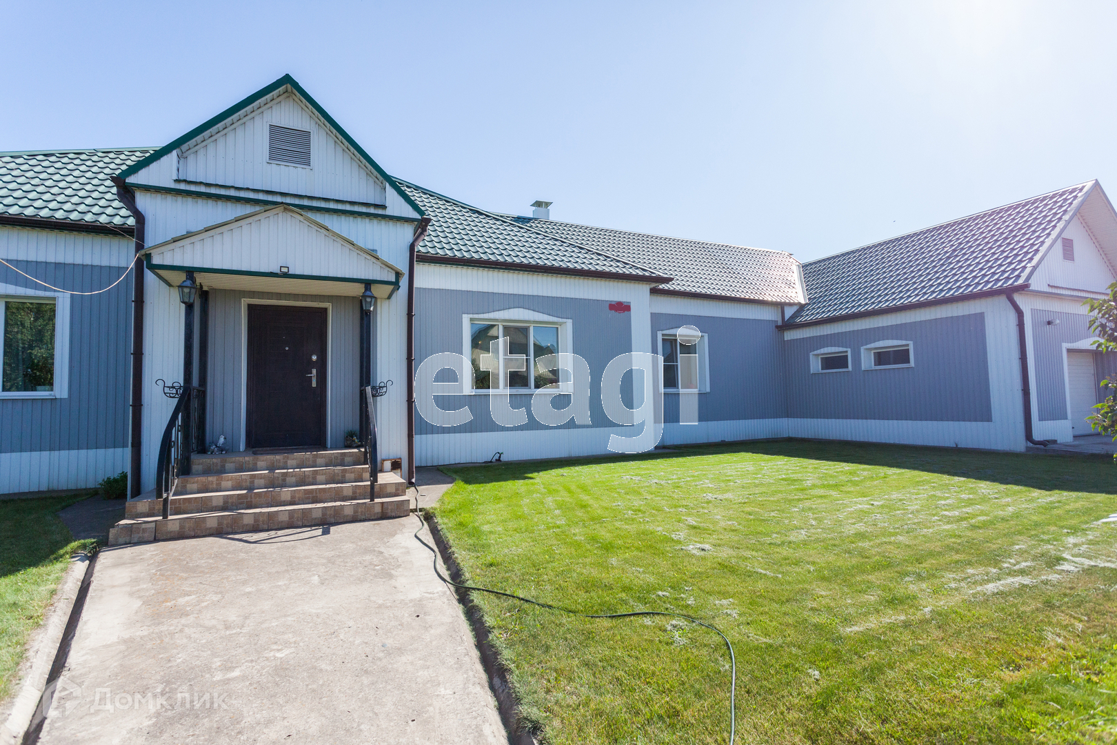 Внешняя облицовка дома оформлена сайдингом. На стороне главного фасада дома расположен въезд в гараж, под одной крышей с домом. Гараж вместимостью на две крупногабаритных автомашины, имеет вход из жилого помещения.