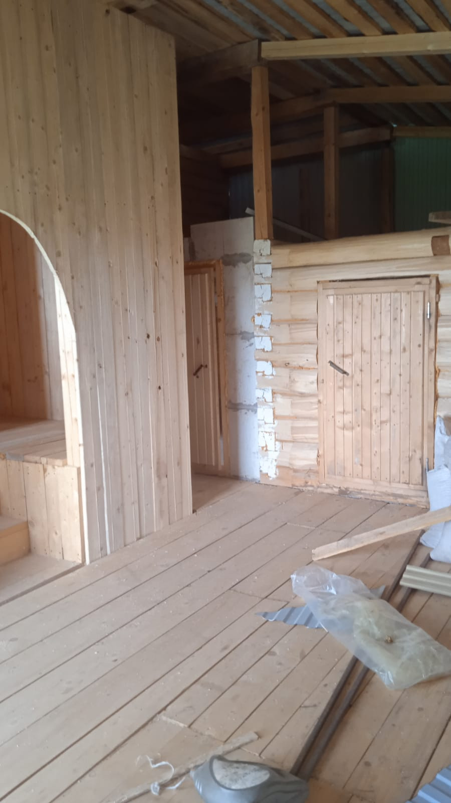 На первом этаже: гостиная, комната, кухня, ванная совмещенная с санузлом. Второй этаж под три комнаты.
