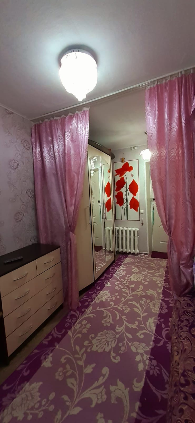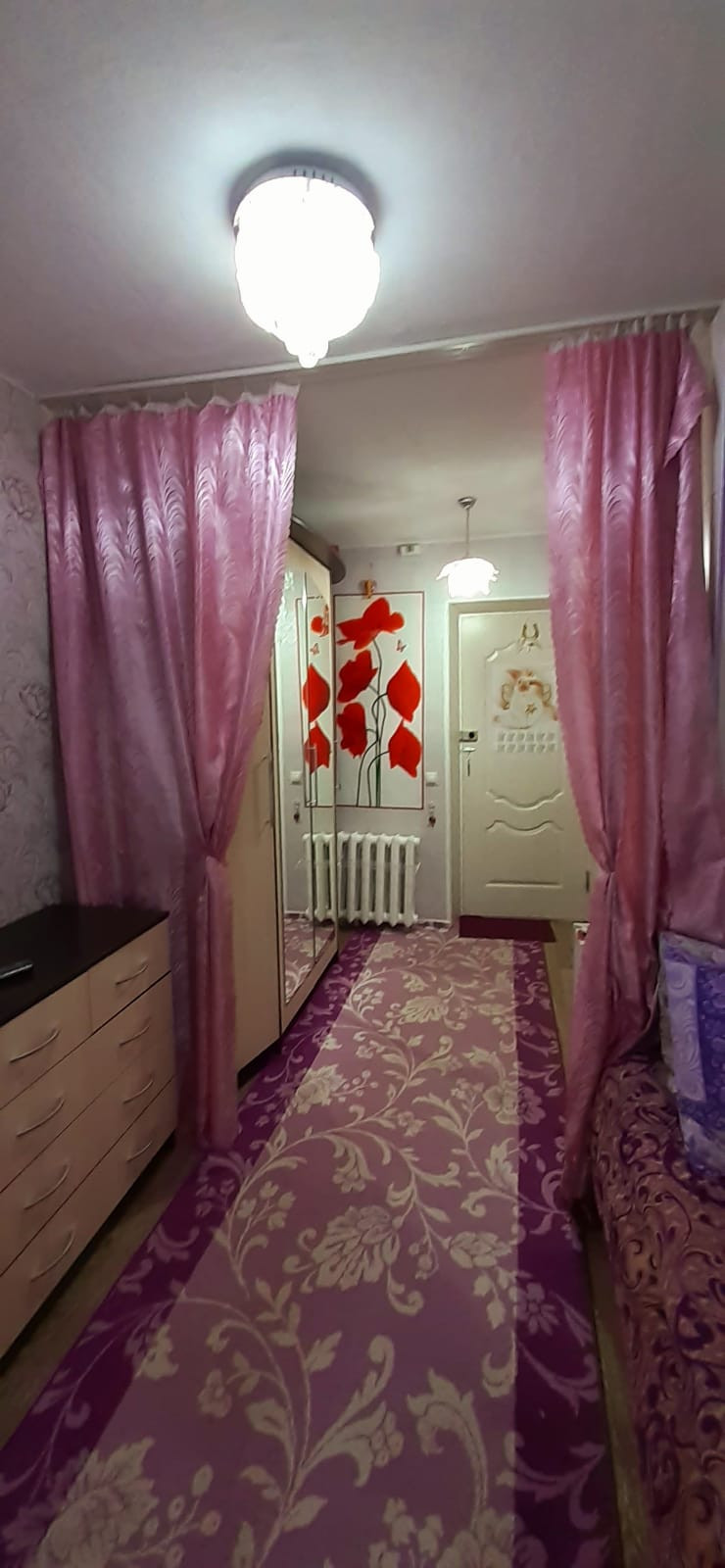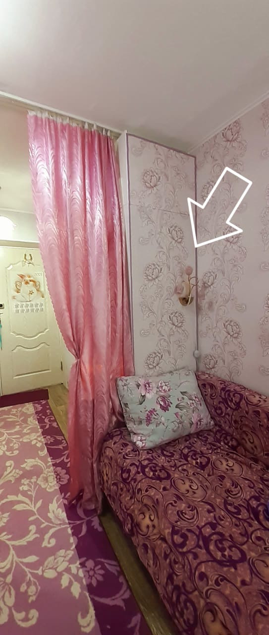 Есть много розеток для удобства. Несколько люстр на потолке для выделения зон где кухонная и спальная, свет включается по отдельности, удобно когда другой человек спит, чтобы не будить. Также, разделение комнаты на зоны шторой, установлена система.