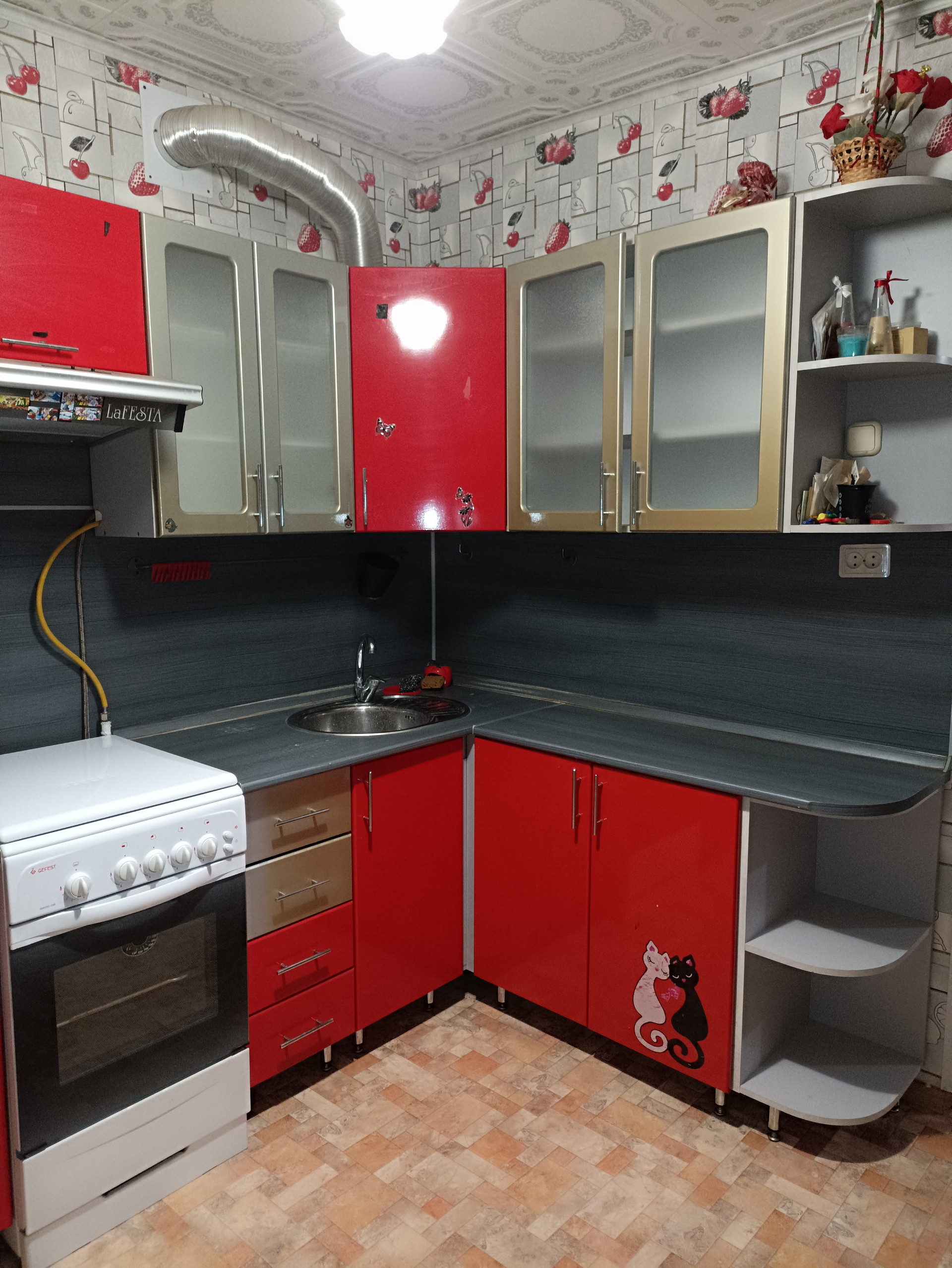 На кухне кухонный гарнитур, пластиковое окно, газовая колонка-автомат, газовая плита Гефест.