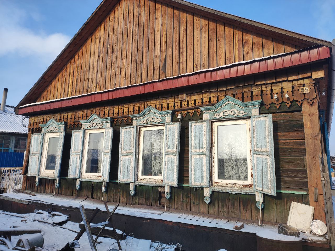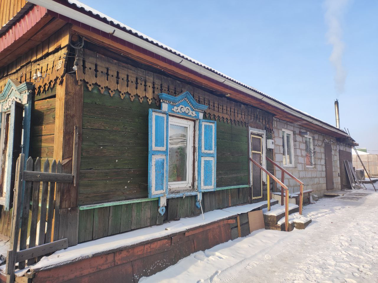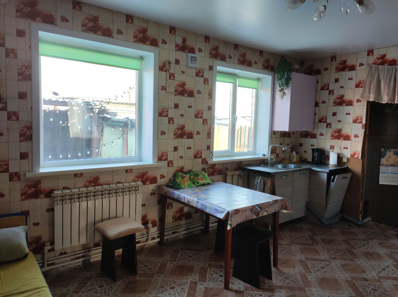 Одноэтажный, одна половина дома бревенчатая, а другая газобетон. В доме: кухня-гостиная,5 комнат (одна комната имеет отдельный вход с огорода), санузел и прихожая. Окна пластиковые. В туалете: душевая кабина, раковина, унитаз. Есть место для хранения заготовок (подполье). В доме имеется два входа.