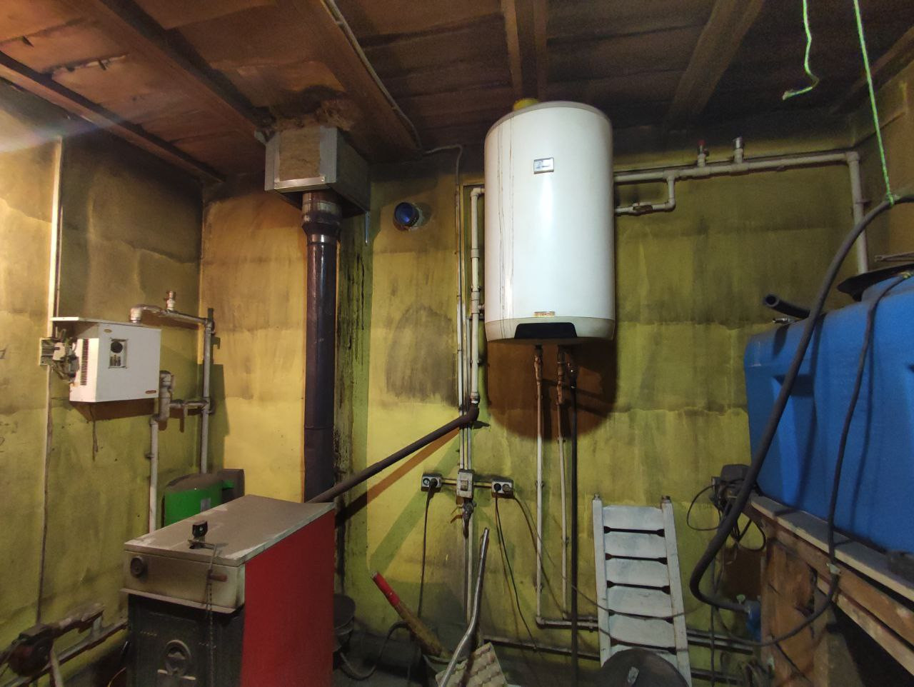 В котельной два входа, с улицы и с дома. В котельной: скважина 8 м, котел с циркуляционным насосом (дрова, уголь), водоразборный бак, насосная станция, электрический котел с циркуляционным насосом, боллер косвенного нагрева. Водоотведение осуществляется в септик из двух бетонных колодцев с переливом объемом 7 кубометров каждый.