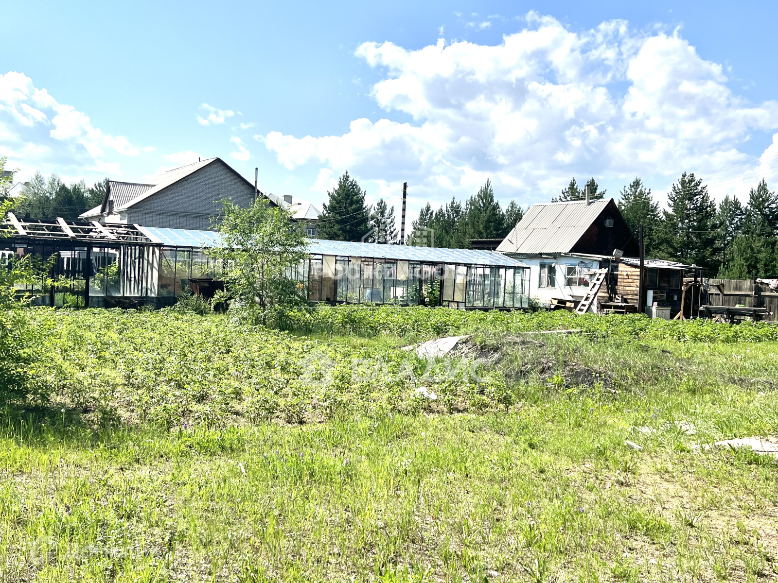 На территории участка баня с верандой, летняя кухня, теплица, насаждения.