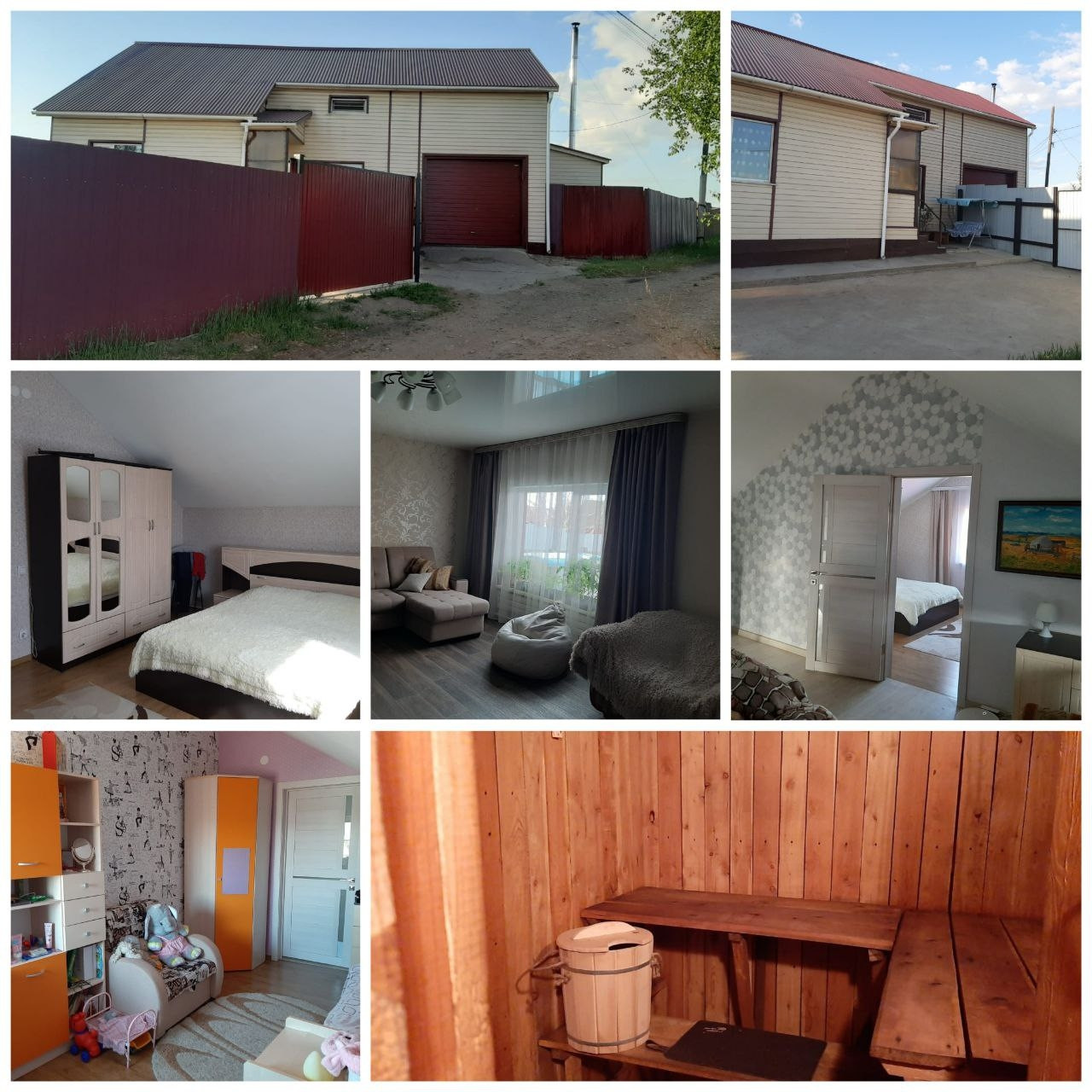 Двор частично забетонирован, есть место для парковки двух автомобилей, участок ухоженный, имеется 2 теплицы, летняя беседка с мангалом. Баня из бруса, площадью 16 кв. м. В доме косметический ремонт. Первый этаж кухня, сан узел, гостиная, кладовая, из дома выход в гараж, на втором этаже большой холл, который можно использовать как самостоятельную комнату, так же три спальни.