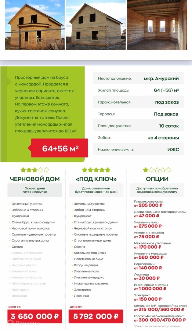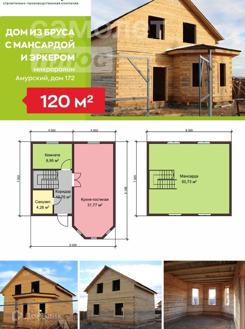 Продается дом из бруса 18*18 с мансардой общей площадью 120 кв.м., крыша ондулин. Просторная кухня-гостиная 31,77 кв.м, 3 спальные комнаты на первом этаже, комнаты в мансарде по вашему желанию, санузел ссовмещенный, объем септика 6 куб.м. Котельная и гараж под заказ. Дом продается в черновом варианте с участком 10 соток, по периметру огорожен с четырех сторон. В доме установлены входные двери с терморазрывом, окна пластиковые КВЕ.