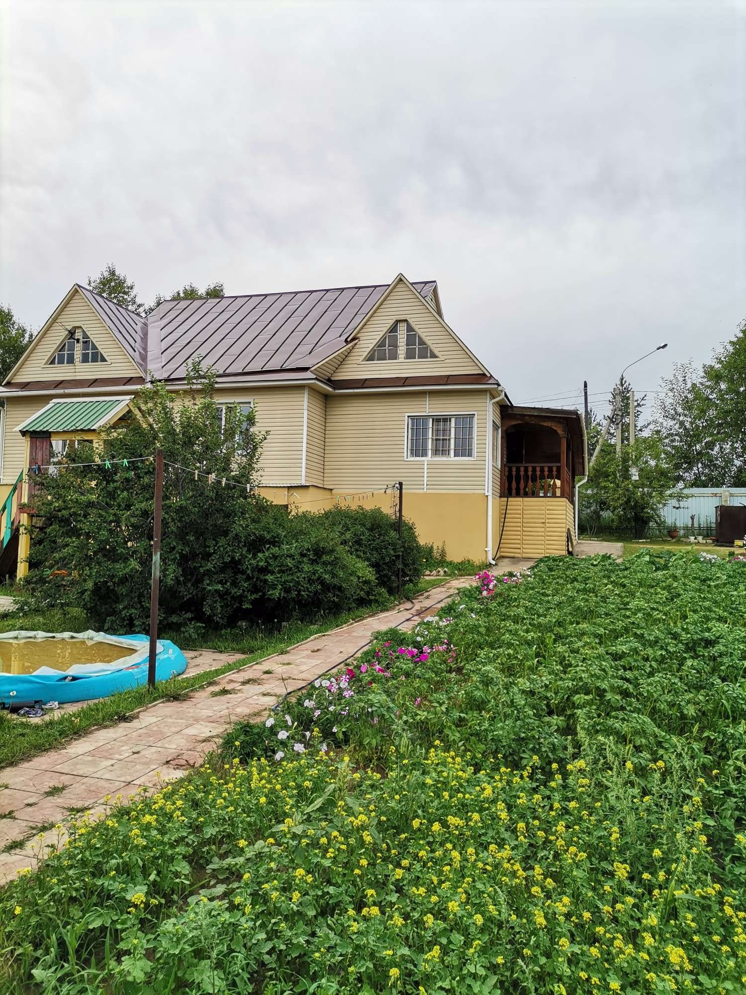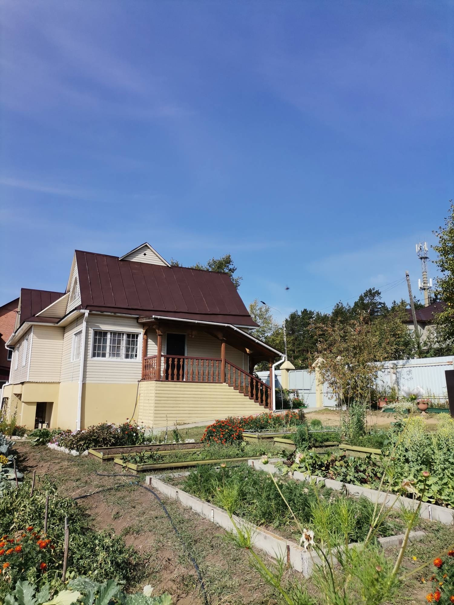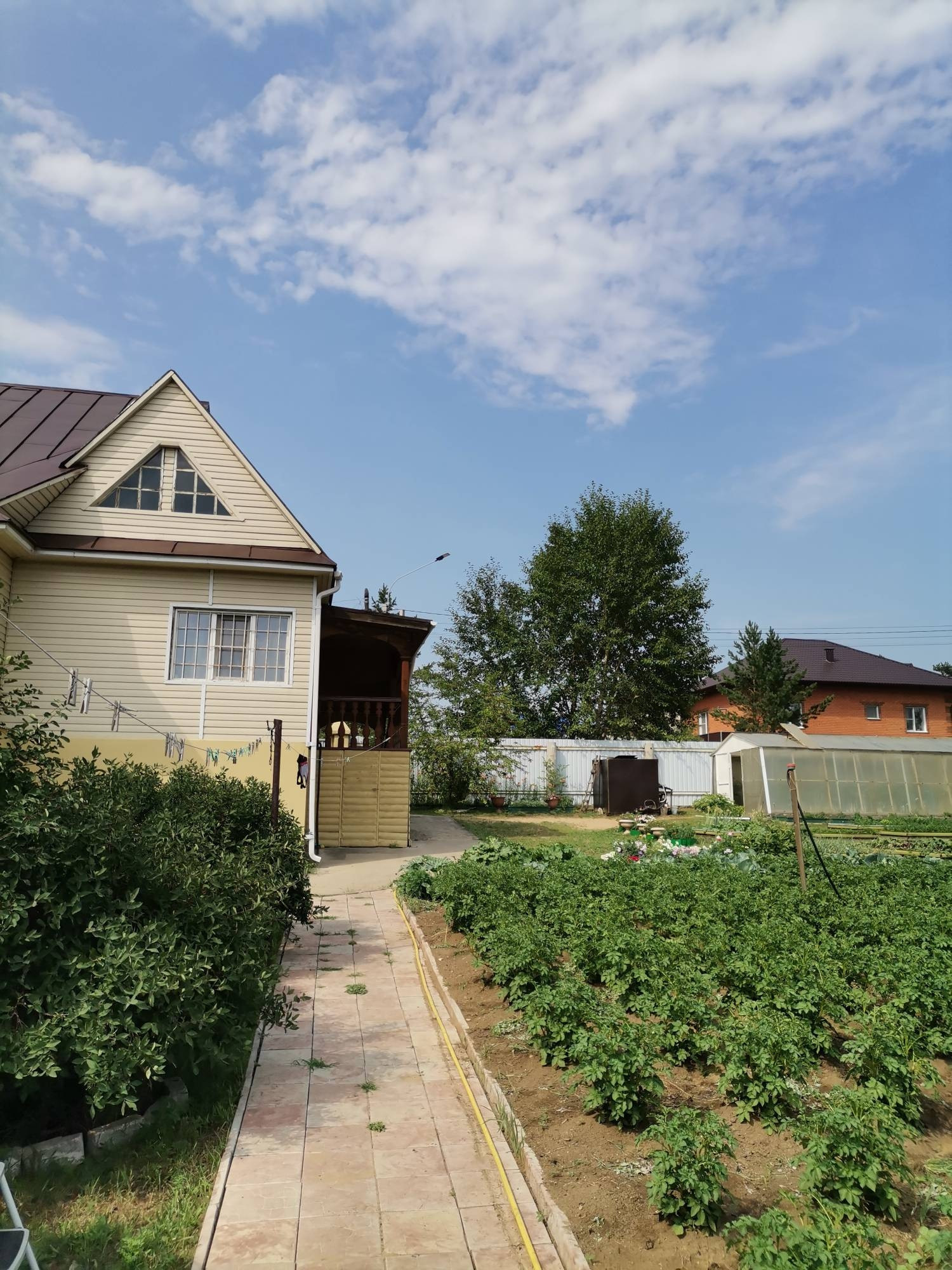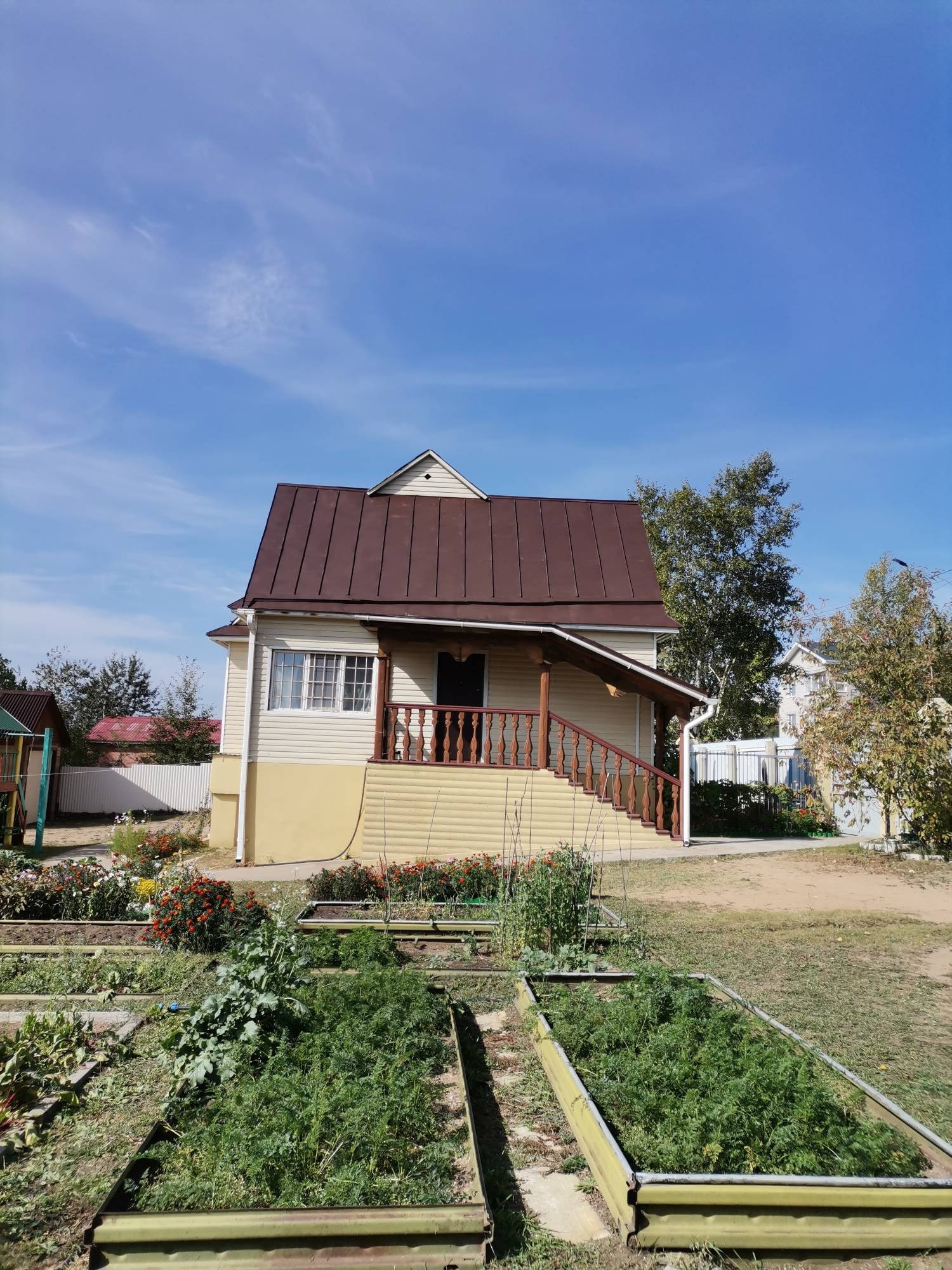 Огород разработан, плодородная почва, имеется емкость для полива, разведена поливочная система по всему огороду. Имеется 2 теплицы, грядки, насаждения: малина, смородина, ирга, черемуха, рябина, слива, вишня, жимолость, земляника, клубника. Небольшая баня с парилкой размер 3*4, летний душ, уличный туалет, детская площадка.