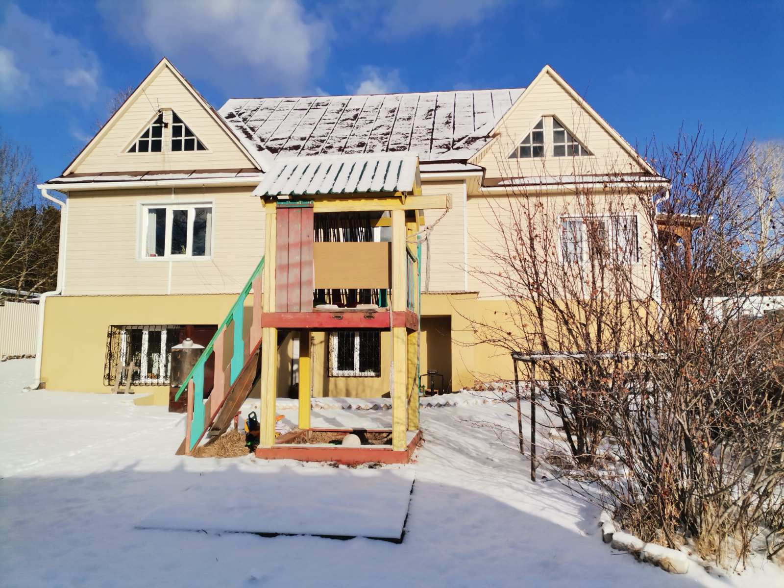 Обжитой тёплый дом 2 этажа. Строили сами для себя. Общая площадь коттеджа 200,0 кв.м., Дом из 18 бруса, утеплен и обшит металлическим сайдингом, очень теплый, окна на солнечную сторону. Вся отделка внутри дома только из экологичных материалов (дерево).