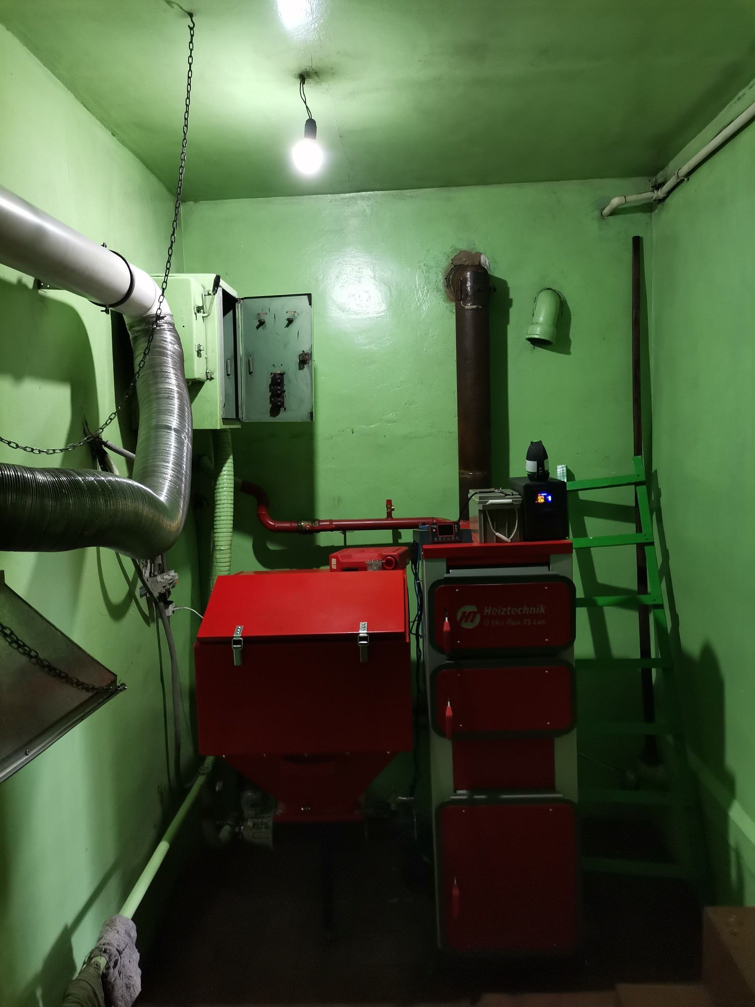 Дом отапливается твердотопливным автоматическим котлом. Работает автономно до 7 суток. Возможно управление котлом дистанционно через Интернет. Работает как на угле, так и на пеллетах. Расход топлива за отопительный сезон не более 8 тонн (40-45 тыс. руб.).
