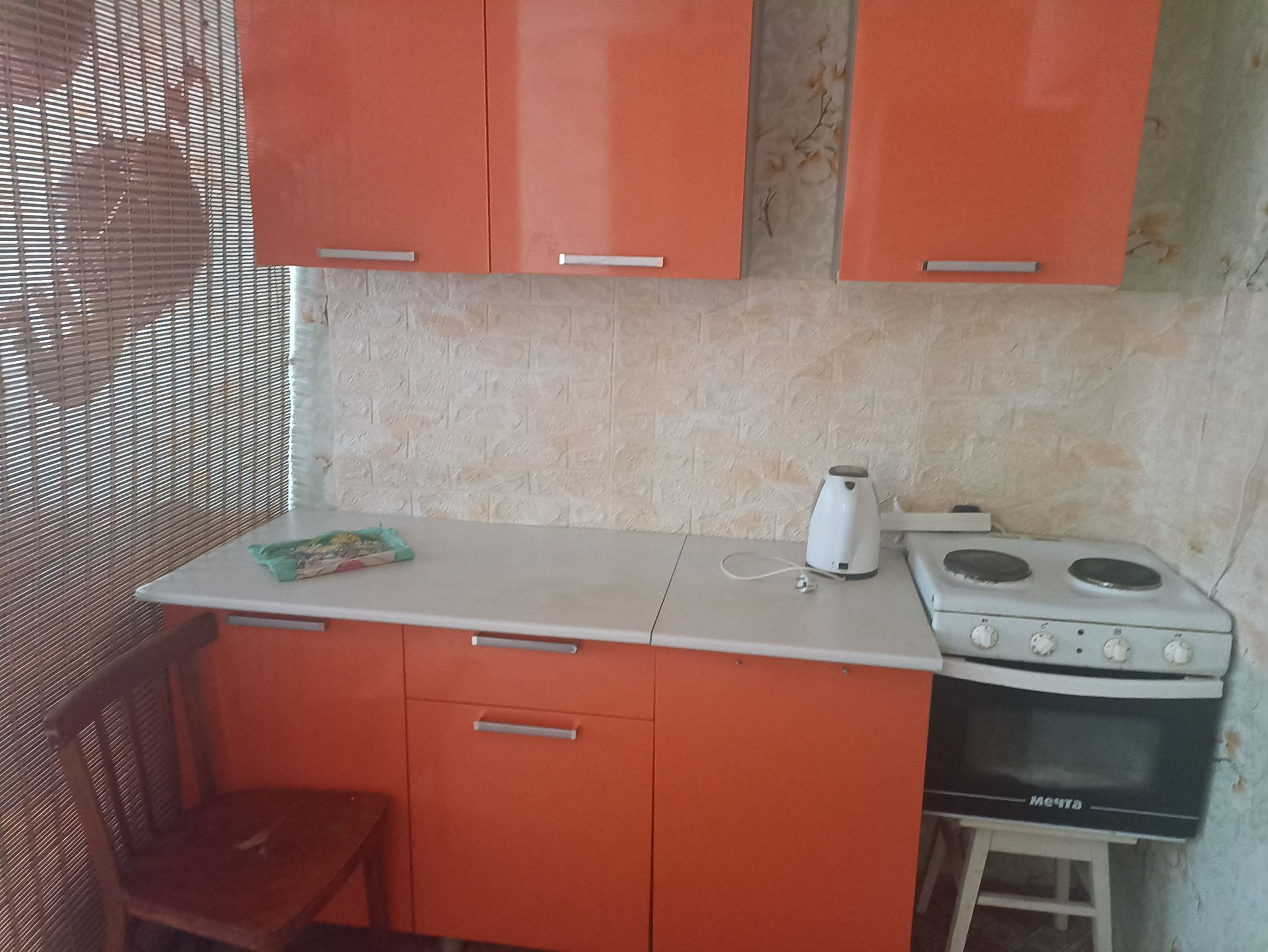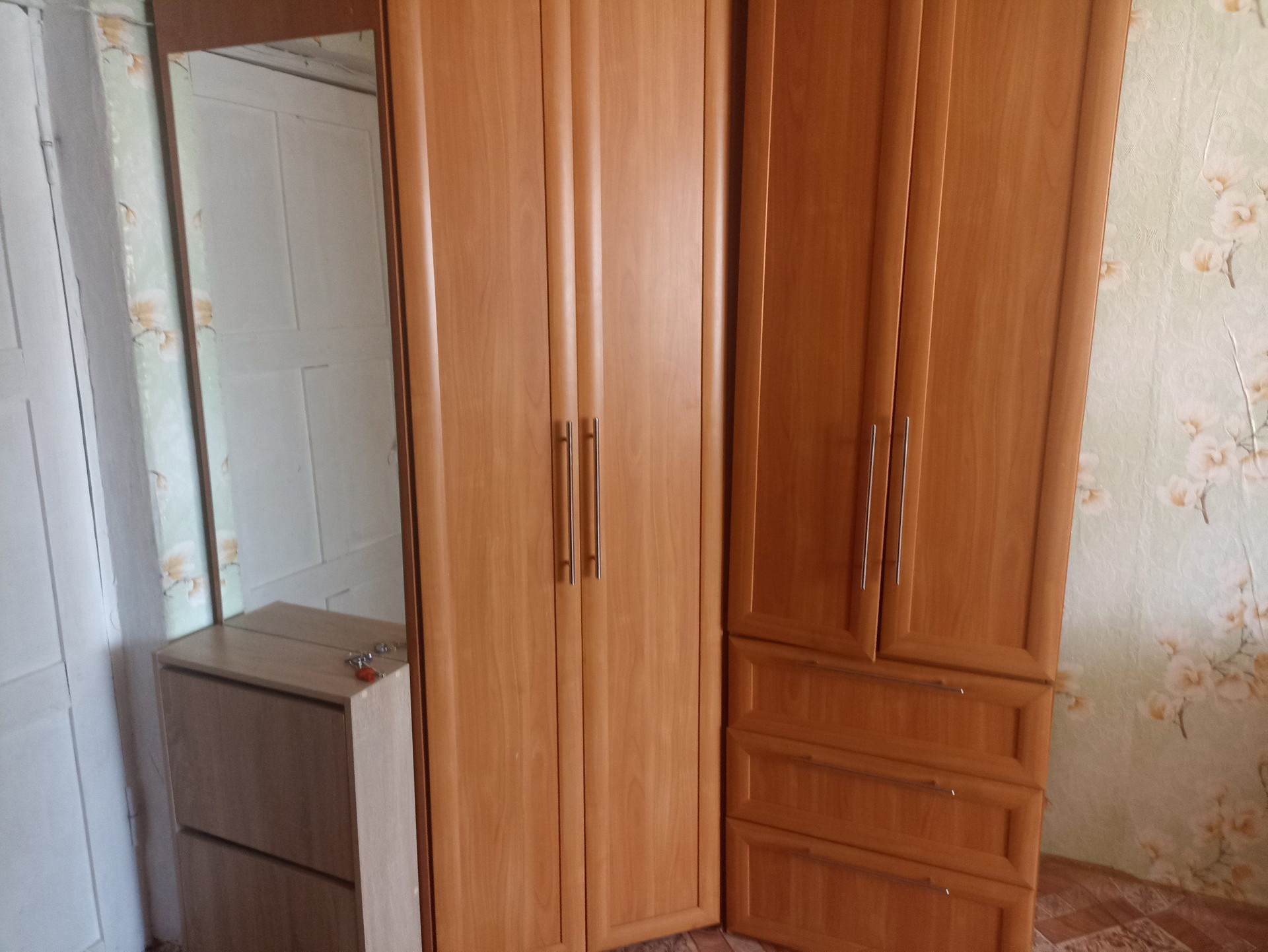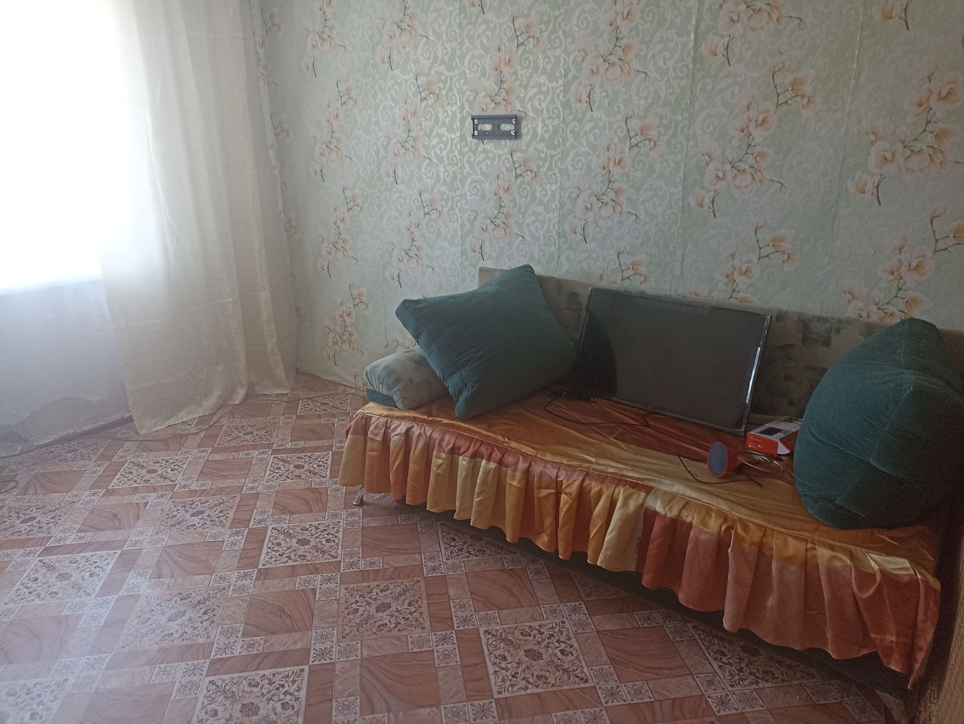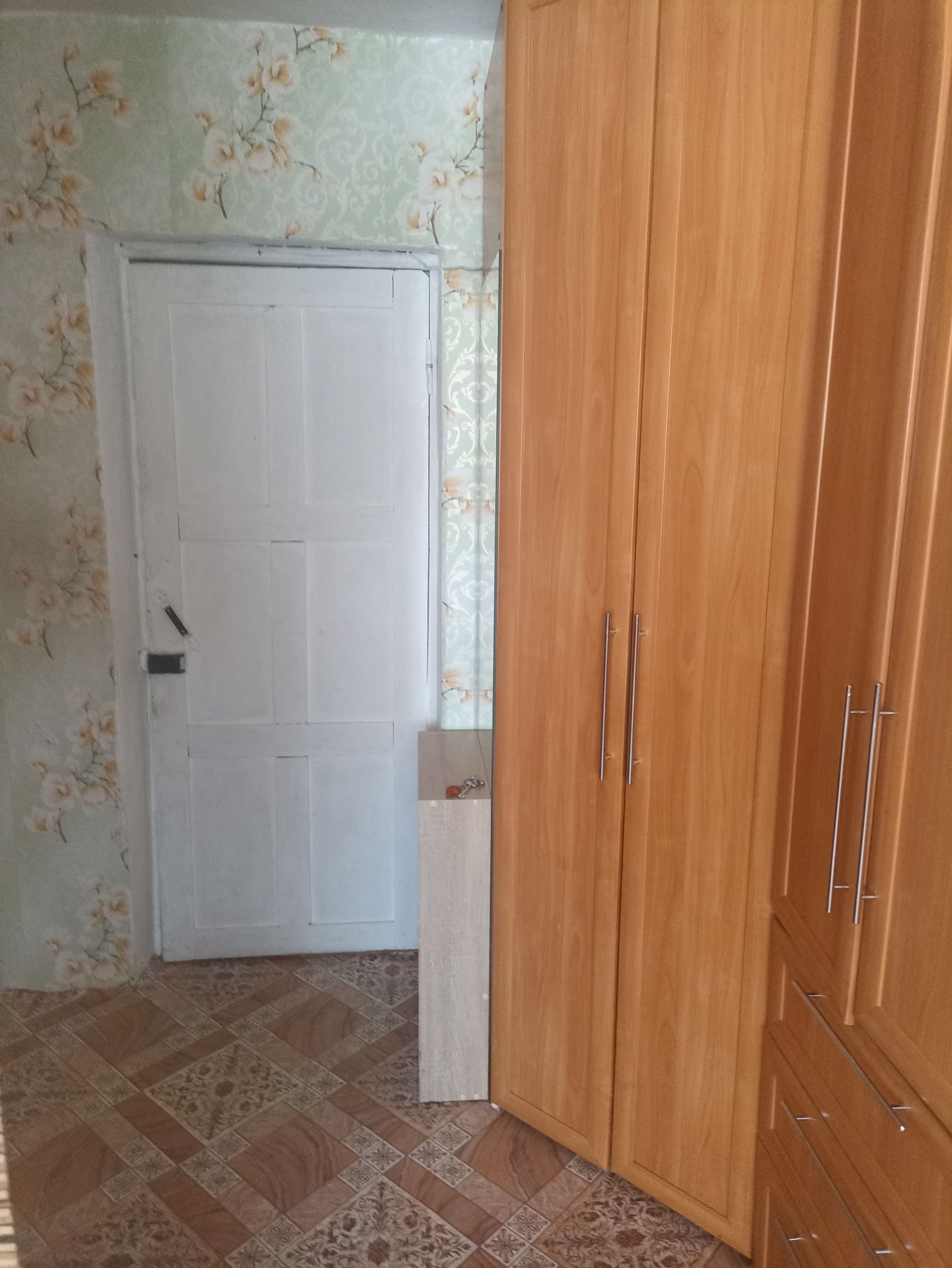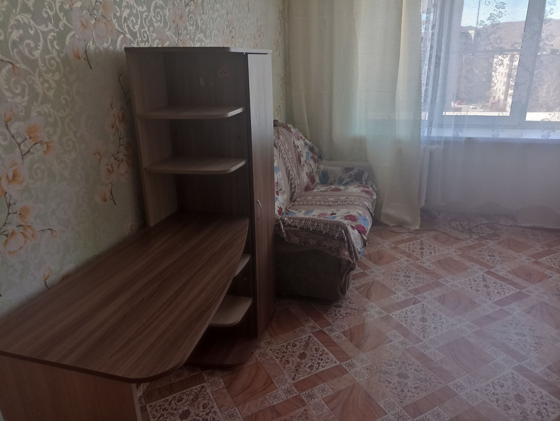 Комната светлая, тёплая. Окно пластиковое. Дверь двойная. В комнате остаётся два дивана, кухонный гарнитур, плита, два больших шкафа, ученический стол