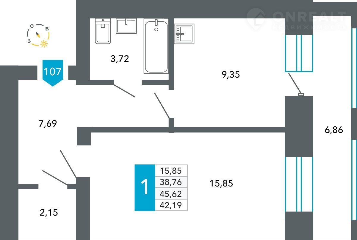 Общая площадь 42.2 м2
