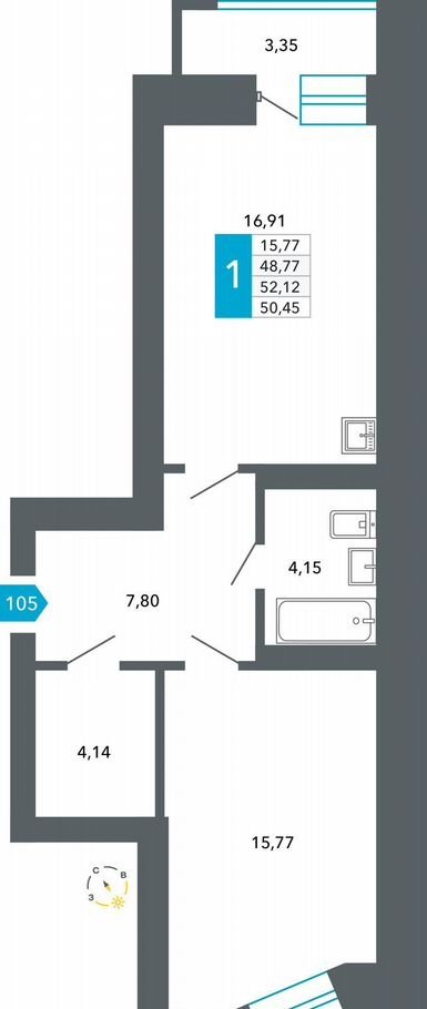 Общая площадь 50.5 м2