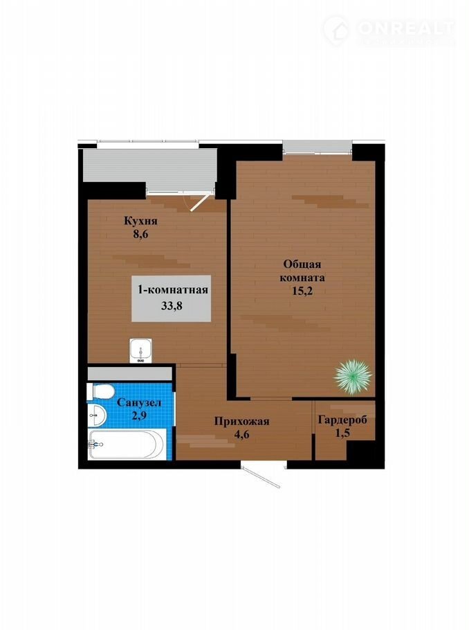Общая площадь 33.8 м2