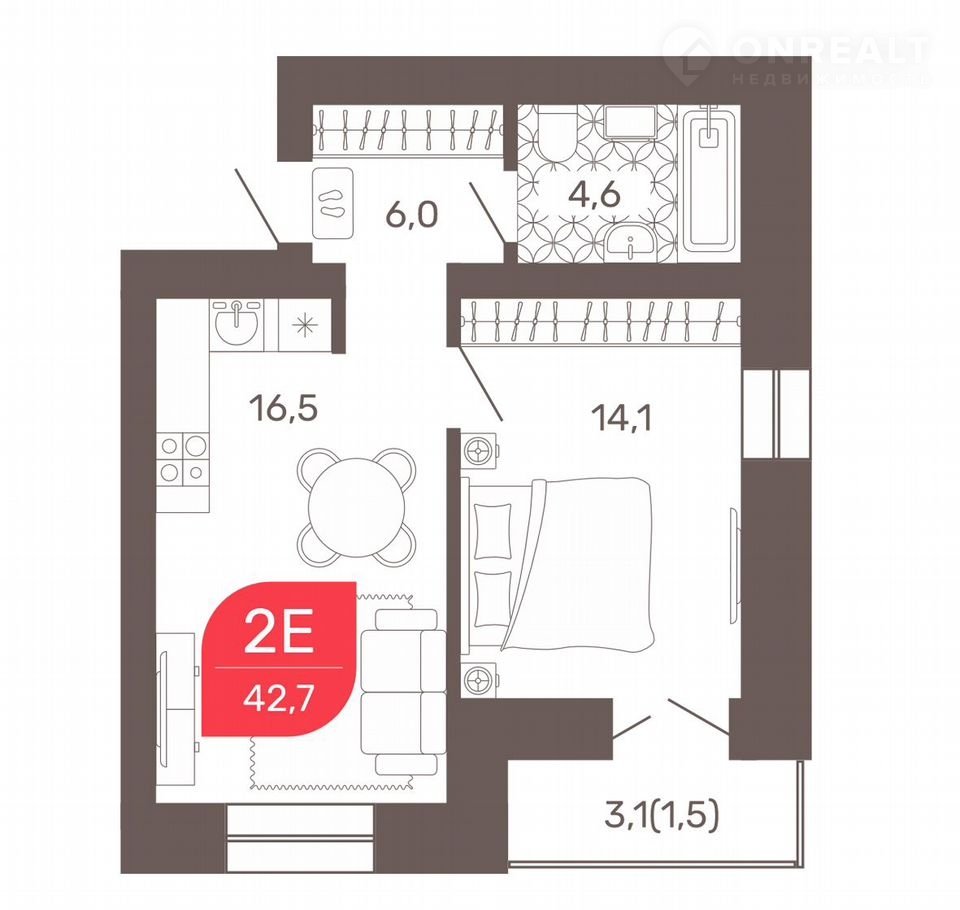 Общая площадь 42.7 м2