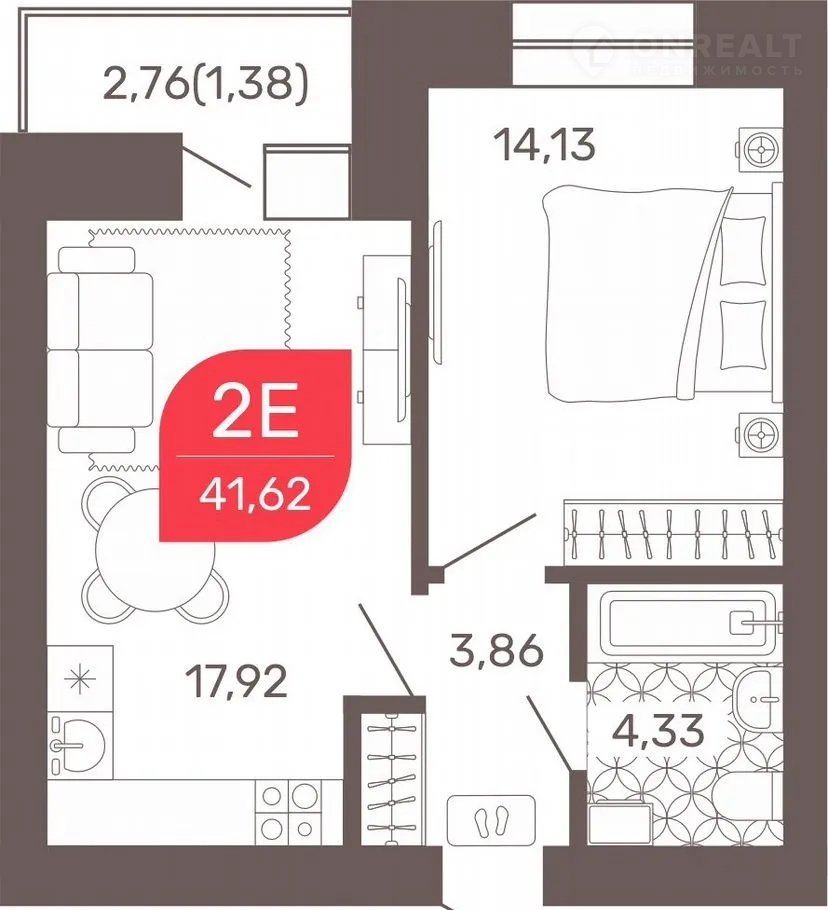 Общая площадь 41.7 м2
