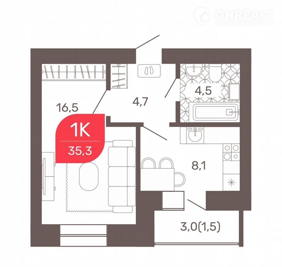 Общая площадь 35.3 м2