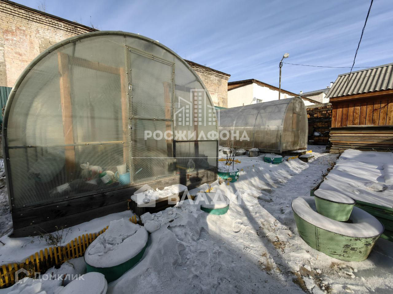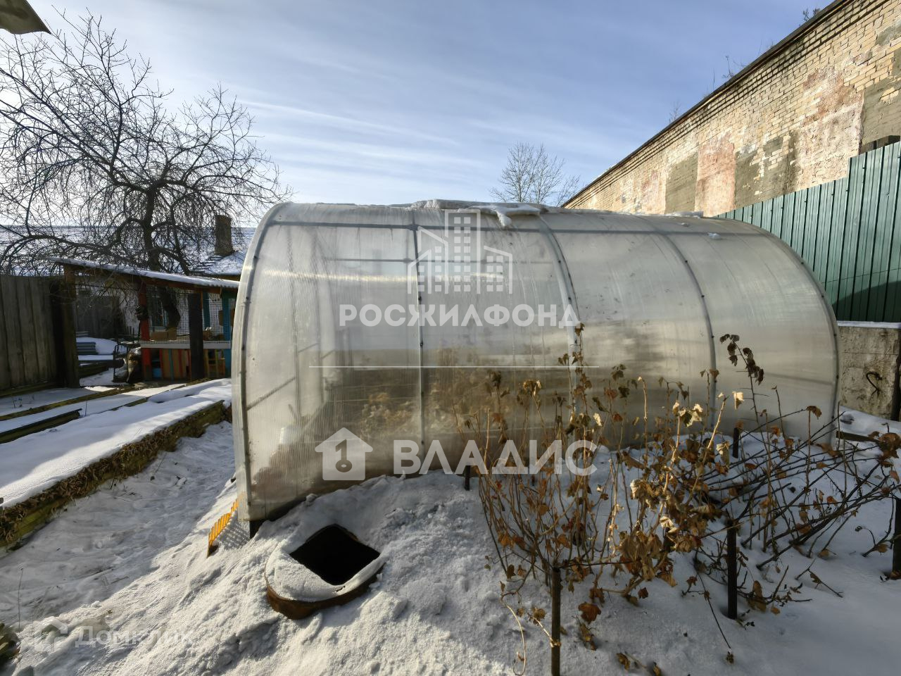 Есть капитальная баня из кругляка, 2 поликарбонатные теплицы, сарай для хранения инвентаря. оборудованные грядки, много насаждений