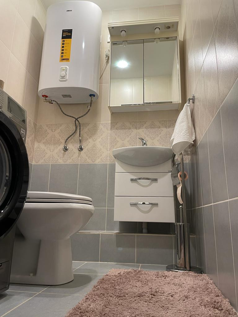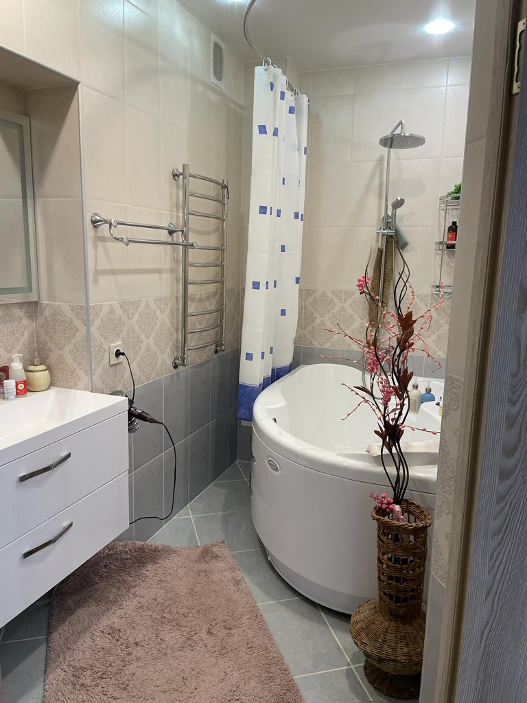 По всей площади квартиры пол выровнен бетоном, произведена полная замена проводки, установлены качественные радиаторы отопления, отштукатурены и выровнены стены, в ванной и в туалете новый кафель, немецкая сантехника, включая смесители Вrаvаt, установлены везде новые счетчики, установлены современные водонагреватели, потолки натяжные, на полу качественный светлый ламинат. Планировка квартиры продумана до мелочей, смотрится очень стильно и просторно, без лишних отгороженных помещений, а значит не будет копится не нужное.
