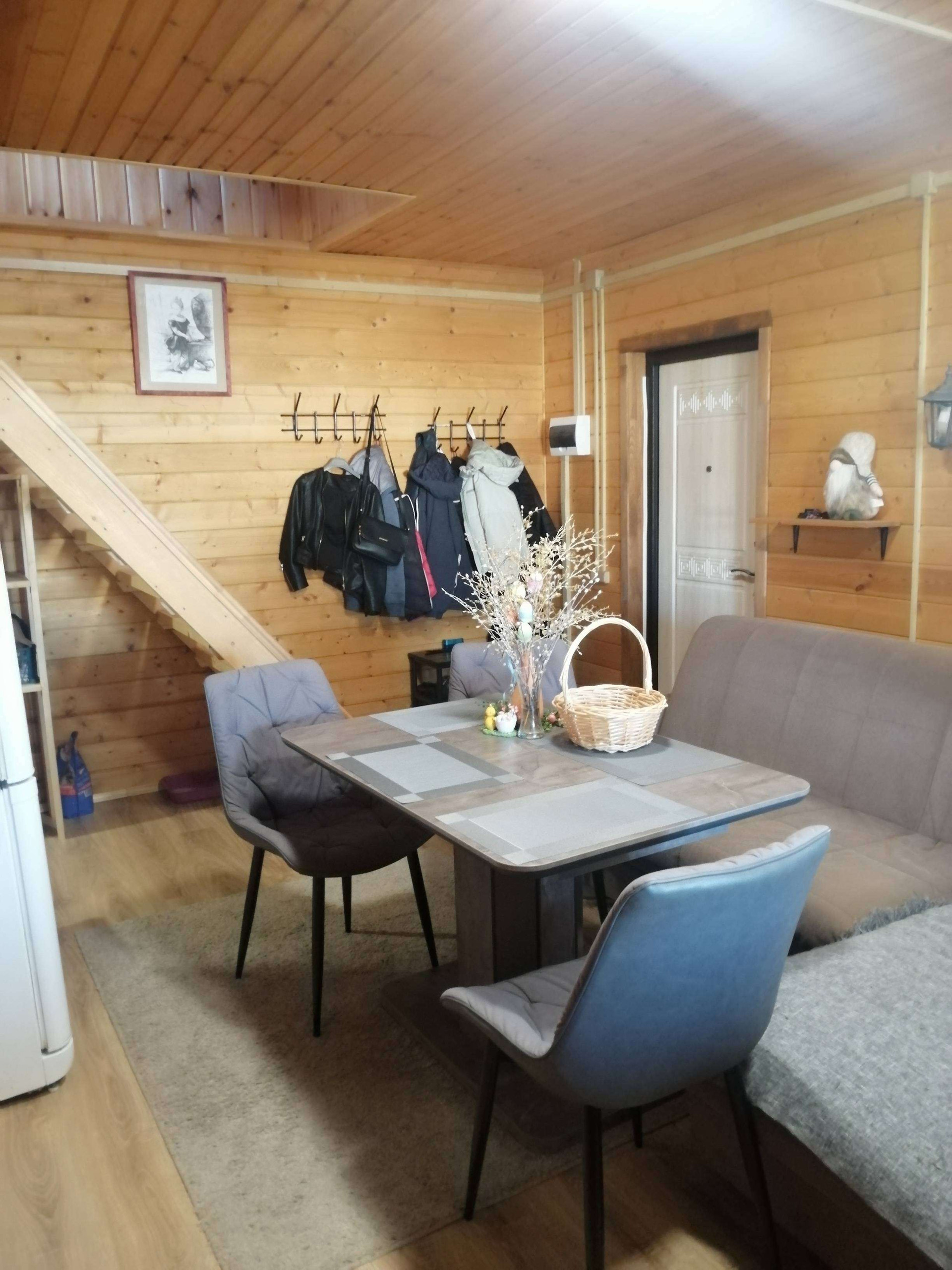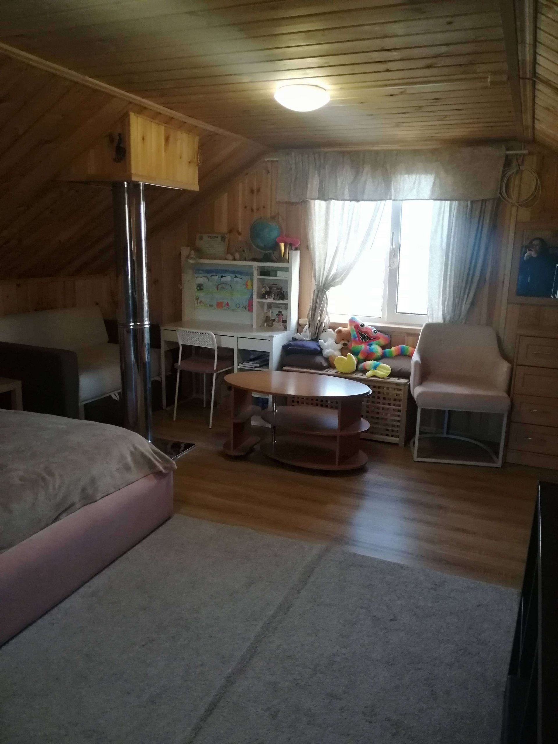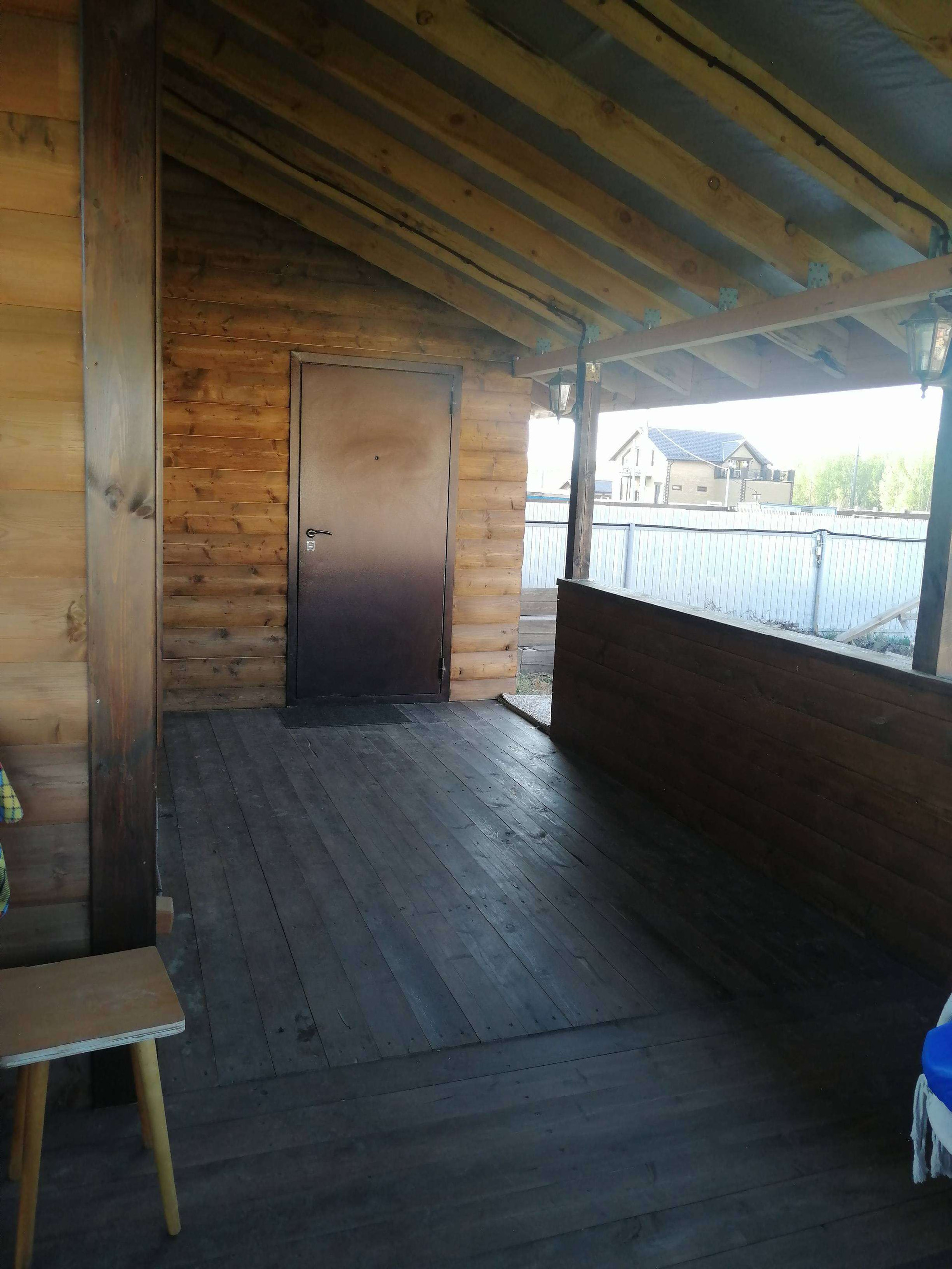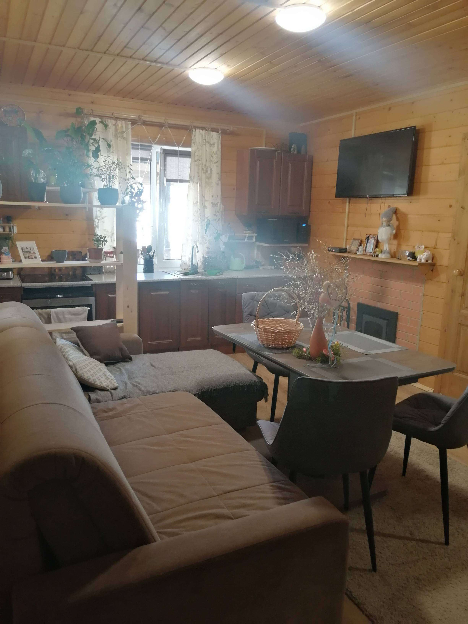 На первом этаже - большая кухня-столовая, парилка (данной печкой можно топить и дом), санузел, душевая и прихожая. На втором этаже- одна большая комната, свободной планировки.С одной стороны дома имеется просторная веранда, которая разделена на две части, с возможностью выхода на участок.