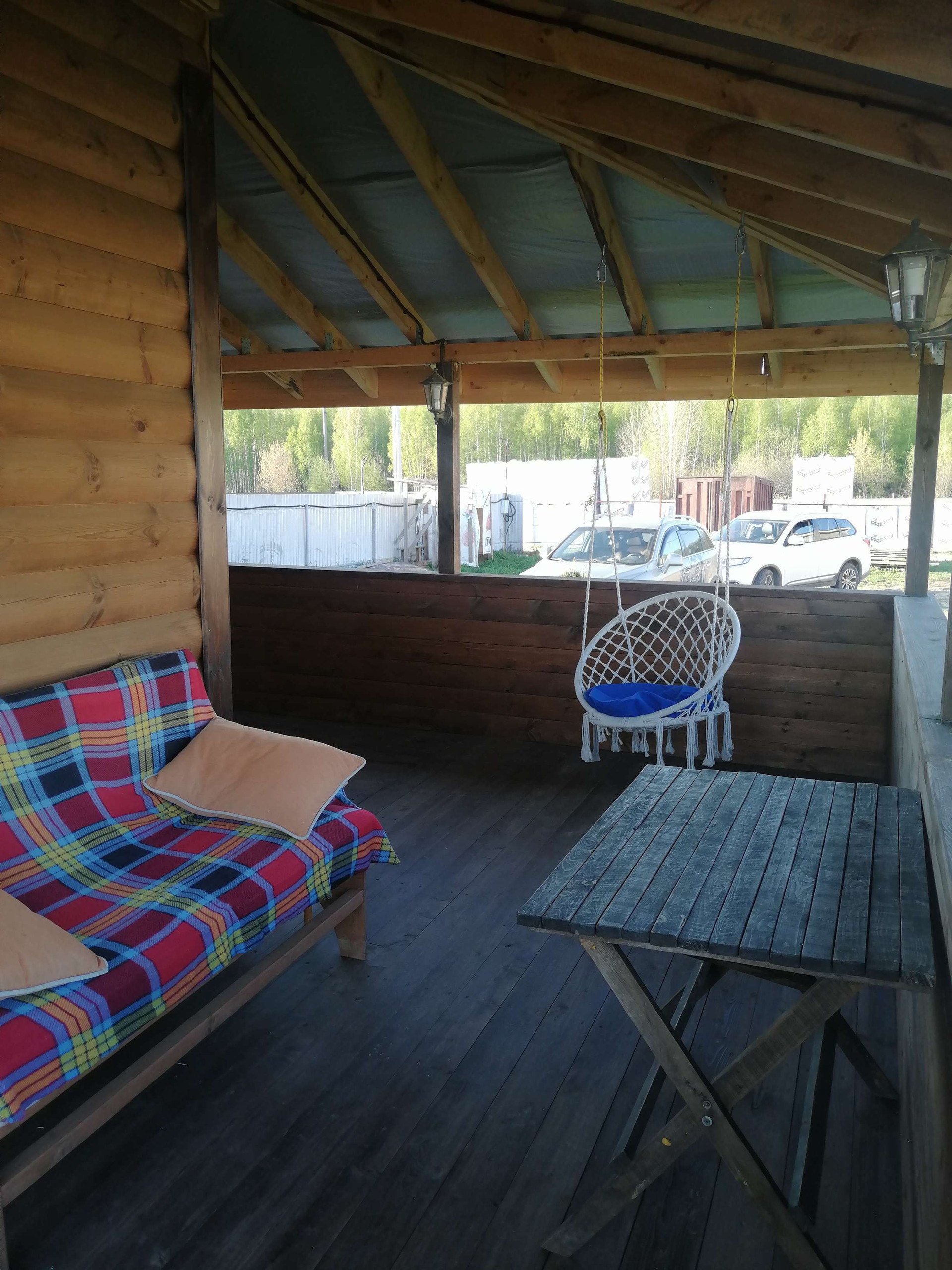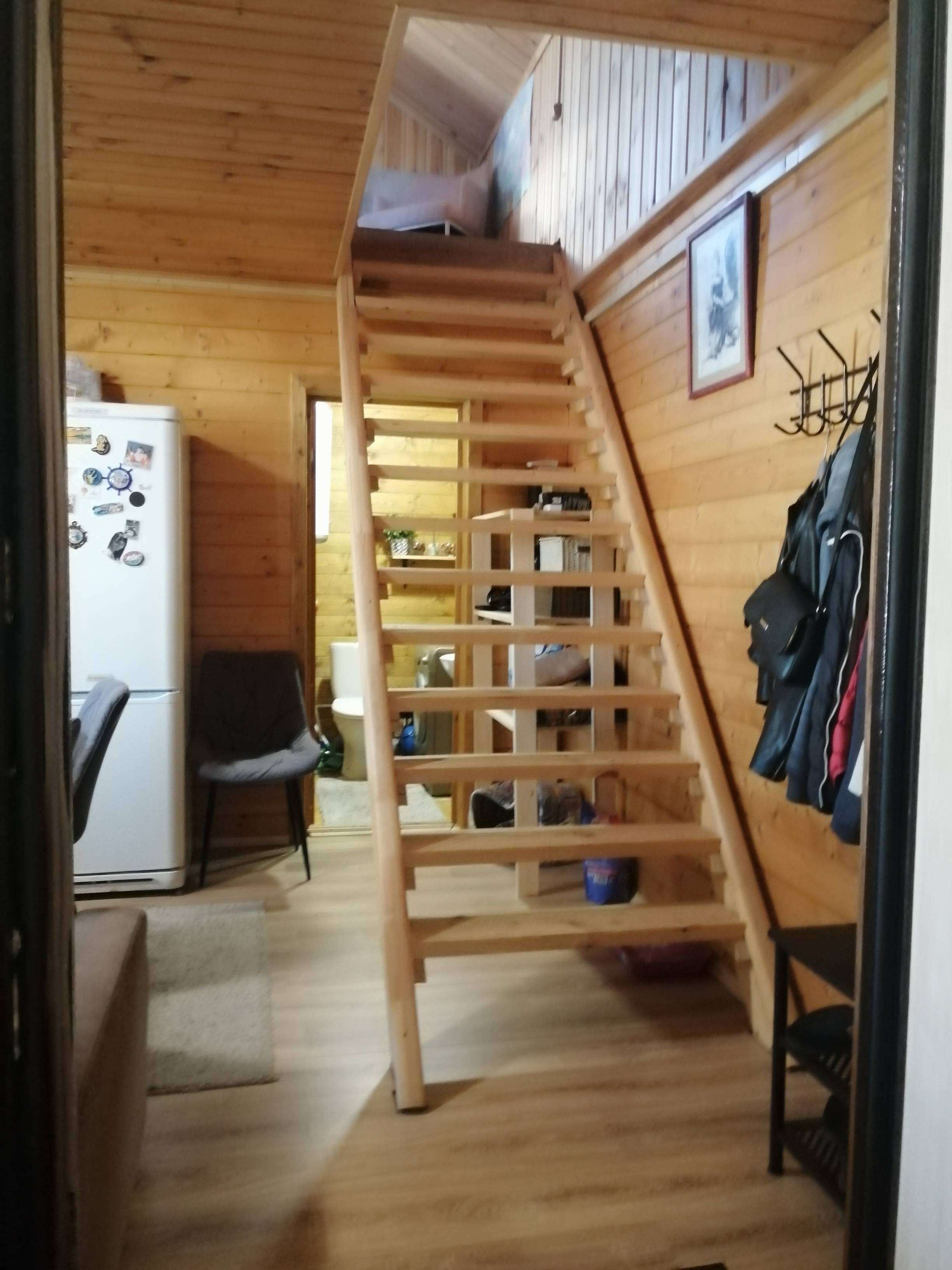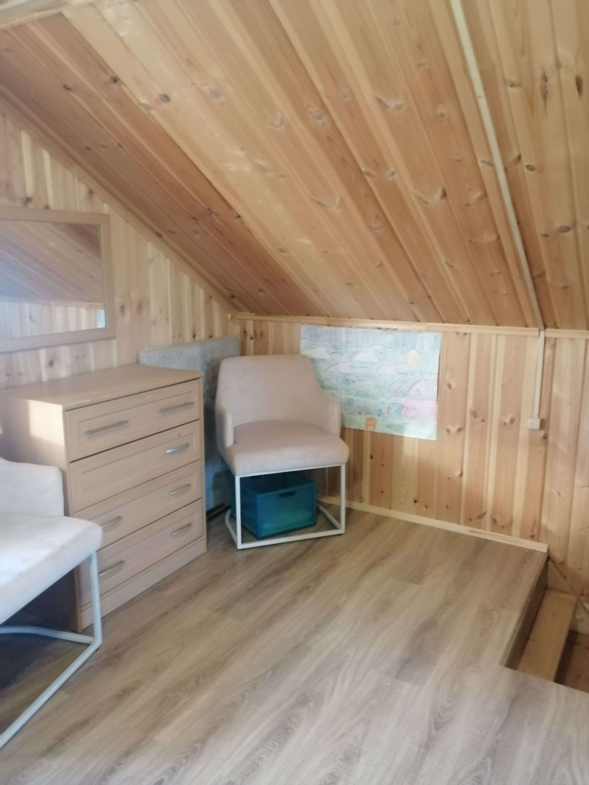 На первом этаже - большая кухня-столовая, парилка (данной печкой можно топить и дом), санузел, душевая и прихожая. На втором этаже- одна большая комната, свободной планировки.С одной стороны дома имеется просторная веранда, которая разделена на две части, с возможностью выхода на участок.