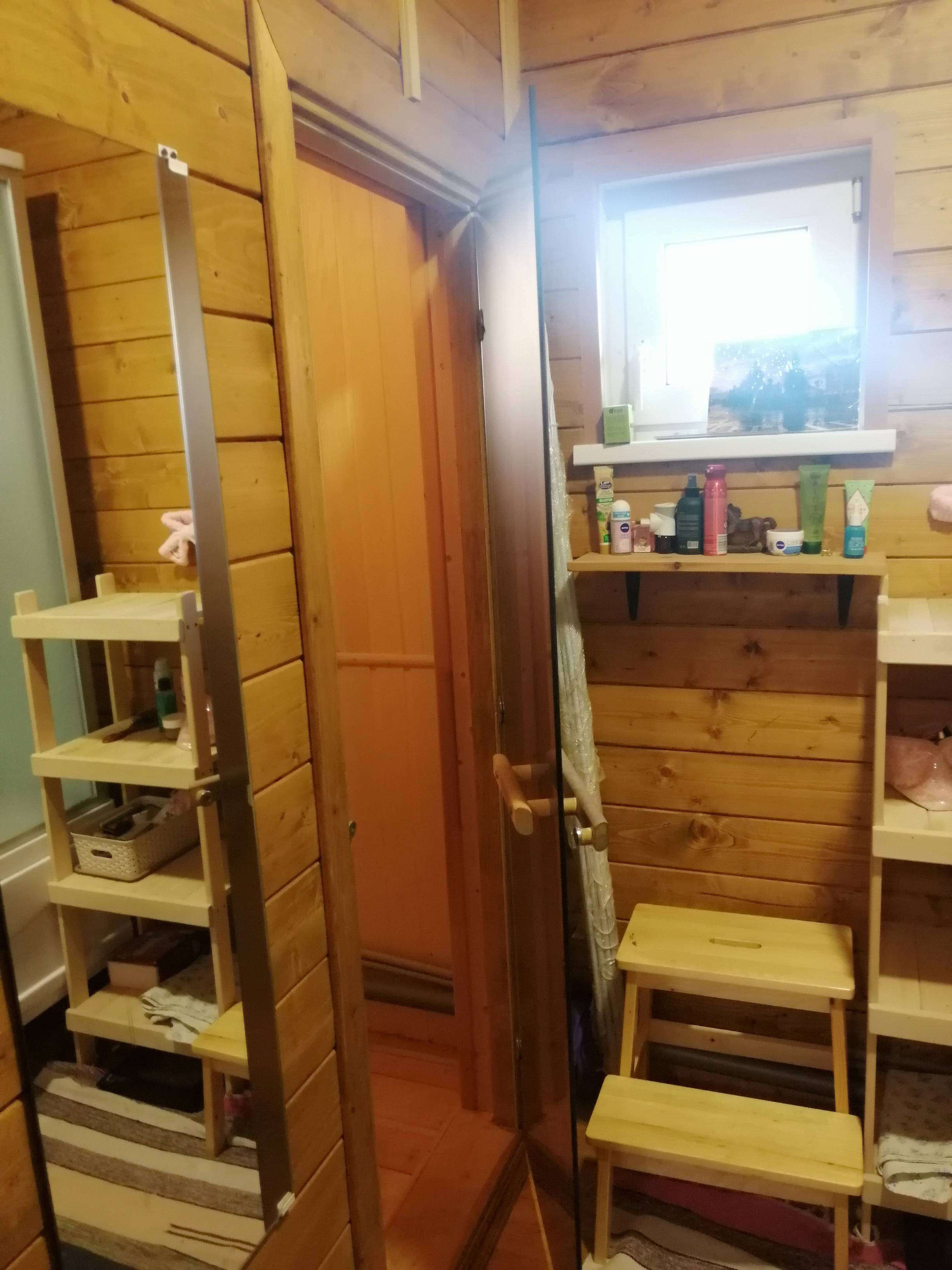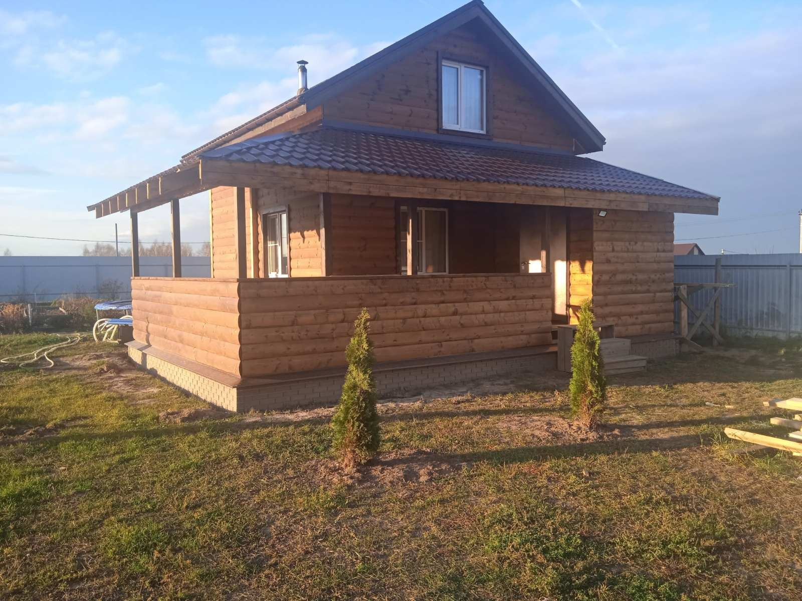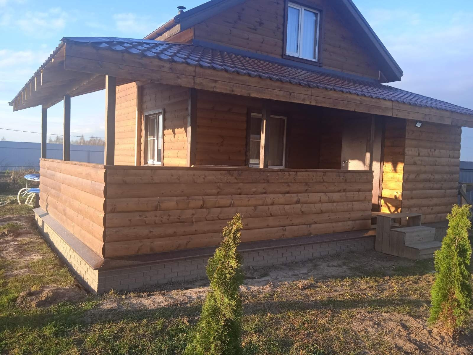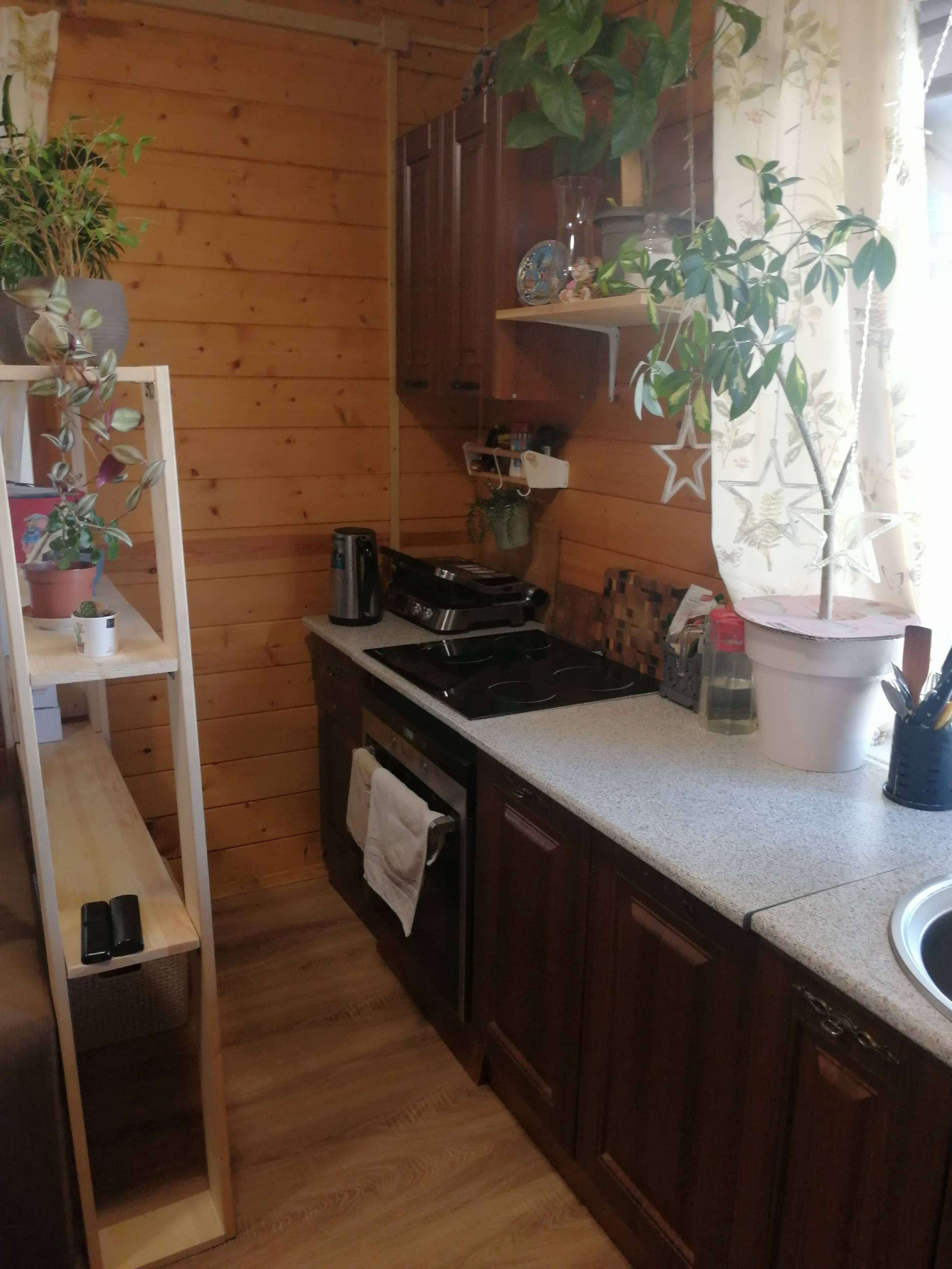 На первом этаже - большая кухня-столовая, парилка (данной печкой можно топить и дом), санузел, душевая и прихожая. На втором этаже- одна большая комната, свободной планировки.С одной стороны дома имеется просторная веранда, которая разделена на две части, с возможностью выхода на участок.
