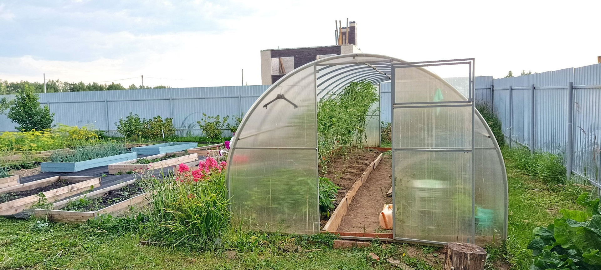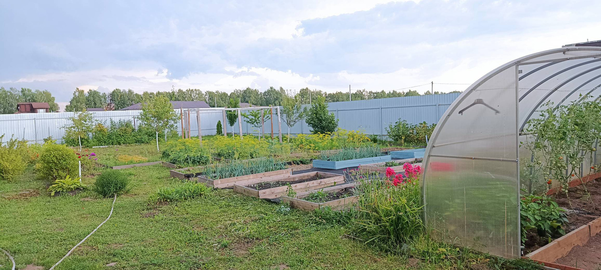 За дом небольшой сад-огород с грядками,теплицей и плодовыми деревьями.